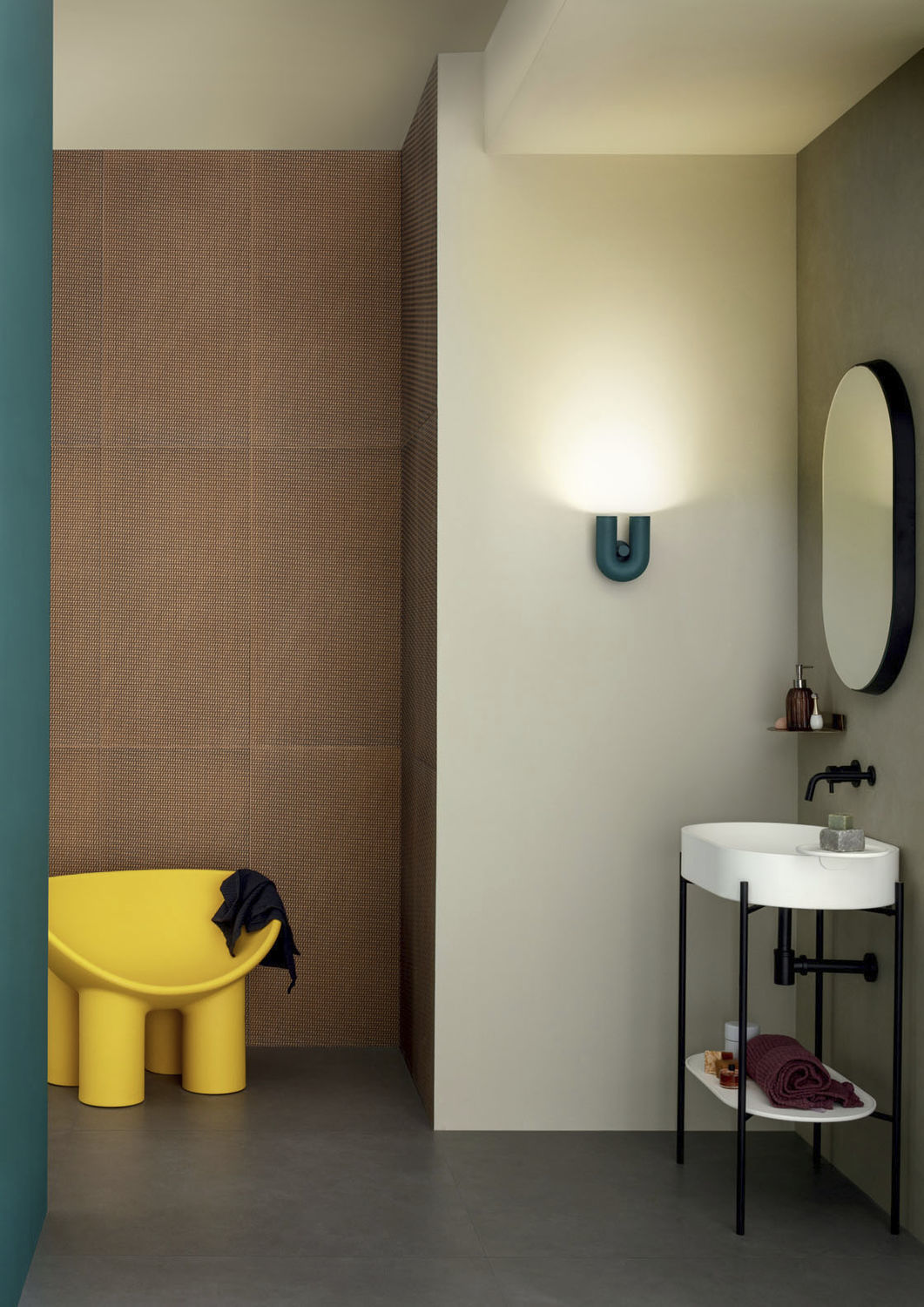 La collection Iro de Sant’Agostino est inspirée du graphisme à la fois matériel et sinueux du plâtre. Elle est ici employée à côté d’un carrelage imitation terrazzo.