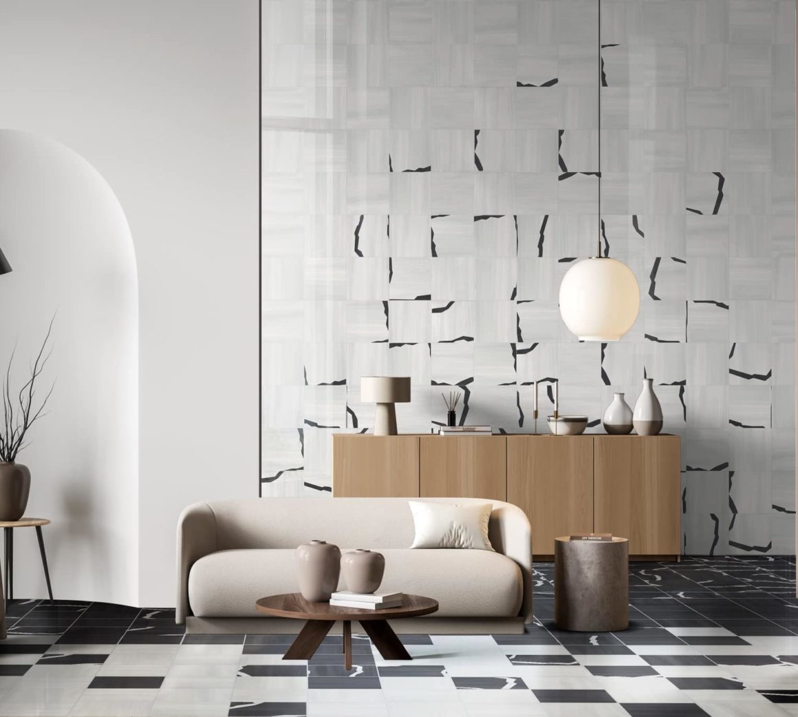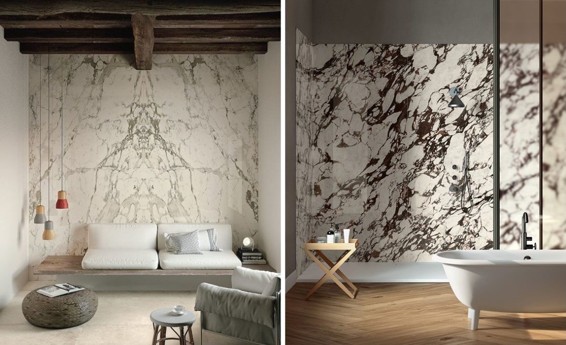 Les marbrures géantes des dalles en céramique parent de grandes surfaces et composent des paysages abstraits. Les carreaux imitation marbre s’agrandissent et les combinaisons de couleurs s’enhardissent. Tout cela crée l’effet d’un grand tableau minéral dans nos intérieurs. Le décor devient théâtral.