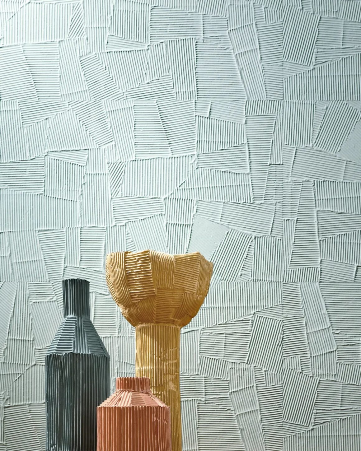 La technique de la pâte à papier, conçue au départ par l’artiste Paola Paronetto pour des vases, a été transformée en carreaux de céramique pour les murs. Homey Paper Clay, Ceramica Piemme.