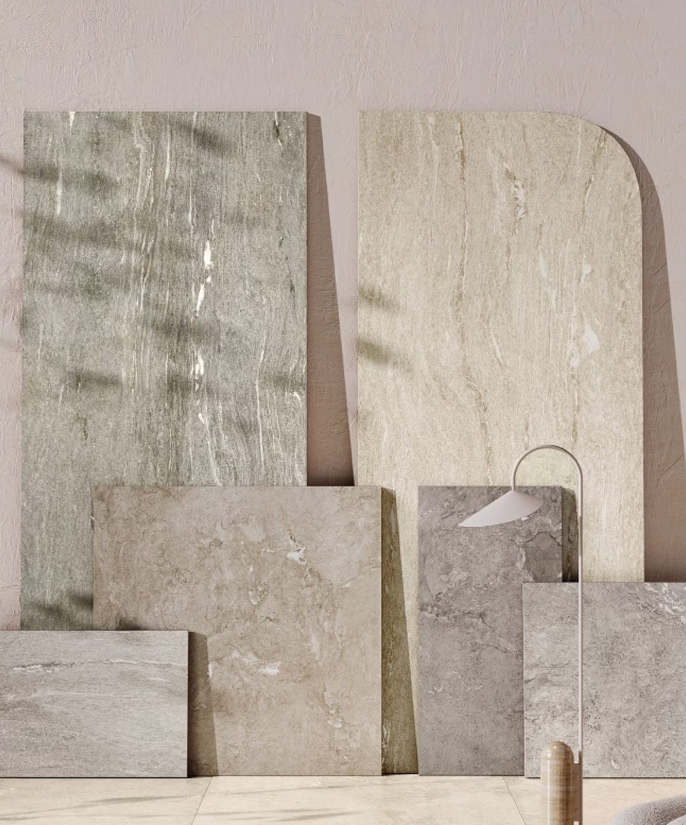 Alpine, Fondovalle. Disponibles en cinq teintes et deux finitions, ces dalles présentent une texture dimensionnelle imprimée en 3D dont l’aspect et le toucher rappellent ceux de la pierre taillée que l’on trouve dans les Alpes.