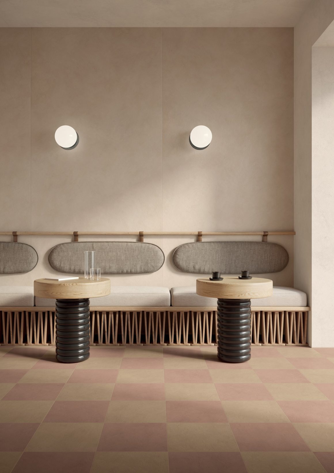 La collection de carrelage pour sol et mur Bioterre est inspirée des techniques de construction en terre crue (pisé). Par Del Conca.