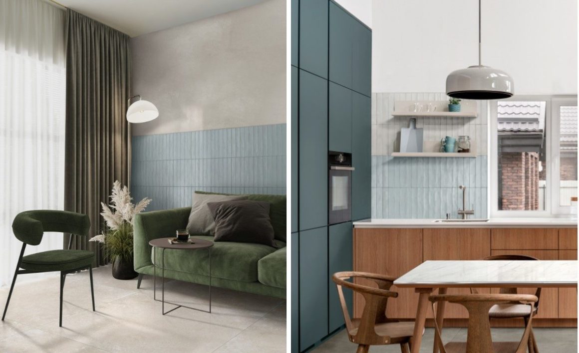 Exemple de carrelage au format brique, employé dans la cuisine et le salon. Collection Wish, Ragno.