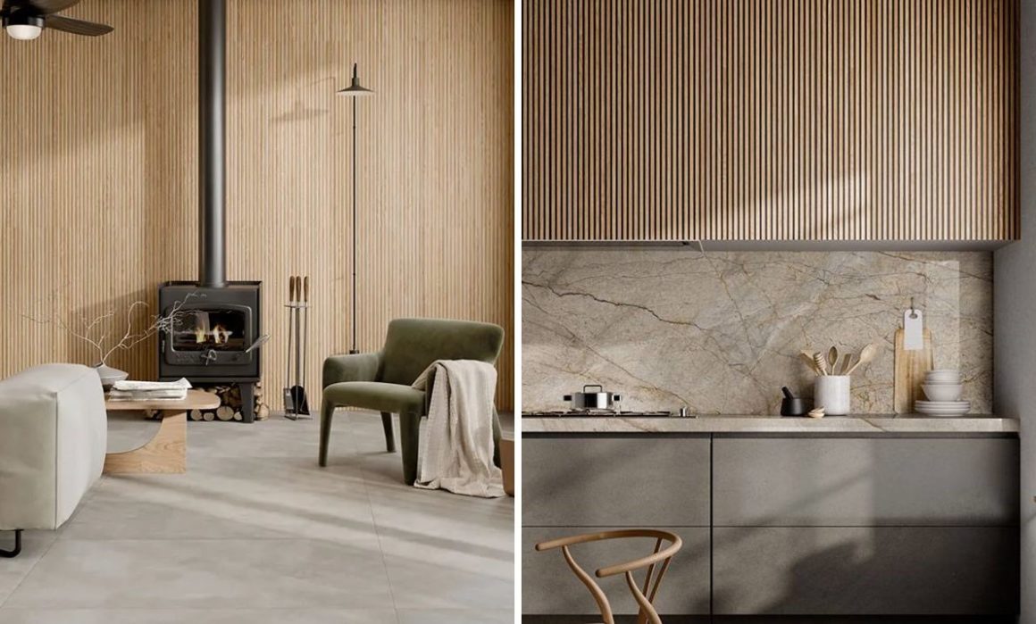 Collection Eik, Refin Ceramiche. Au mur, carrelage imitation bois cannelé.