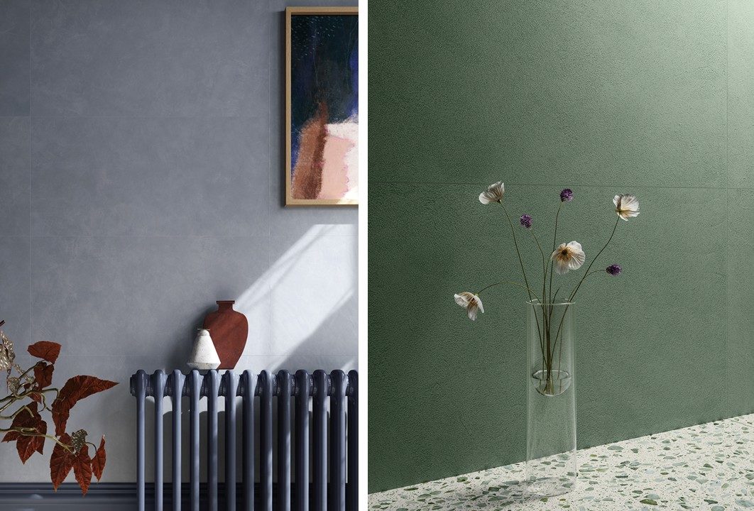 Gauche: carrelage effet résine, collection Insideart de Ceramica Sant’Agostino. Droite: collection Iro inspirée du graphisme à la fois matériel et sinueux du plâtre. Aussi du fabricant Ceramica Sant’Agostino.