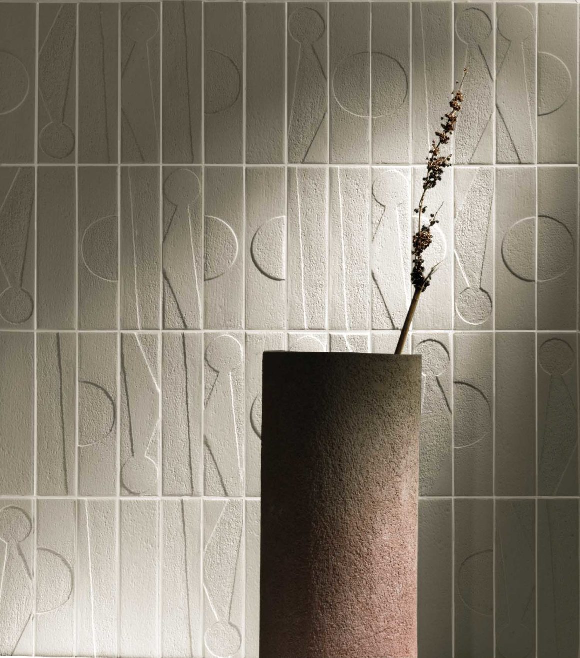 Explorant la relation entre la matière et la lumière, les carreaux se dotent de surfaces rugueuses tridimensionnelles qui enrichissent les murs d’une matérialité nouvelle.