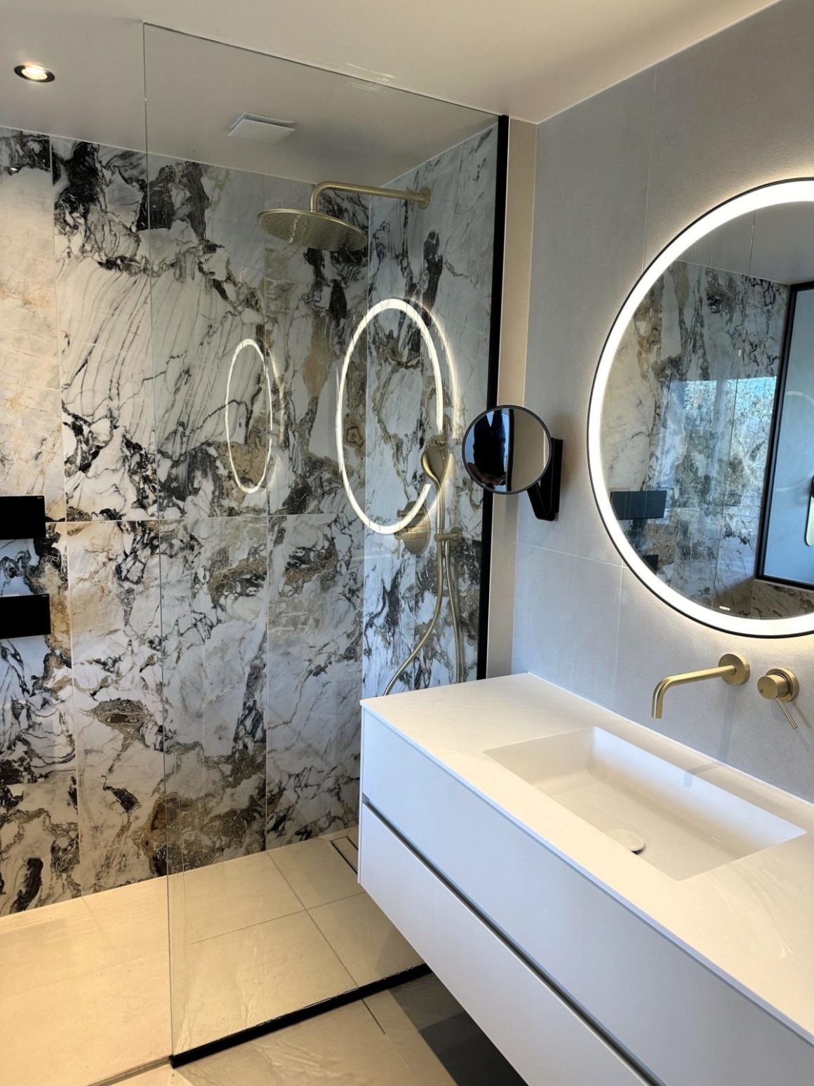 Dans le secteur de la salle de bain, grâce à sa maîtrise du façonnage et de la sécurisation du verre, la société a fait de la fourniture et pose d’installations de douche sa spécialité. Elle utilise notamment le traitement Clearshield, qui permet de rendre les verres bien plus faciles à nettoyer.