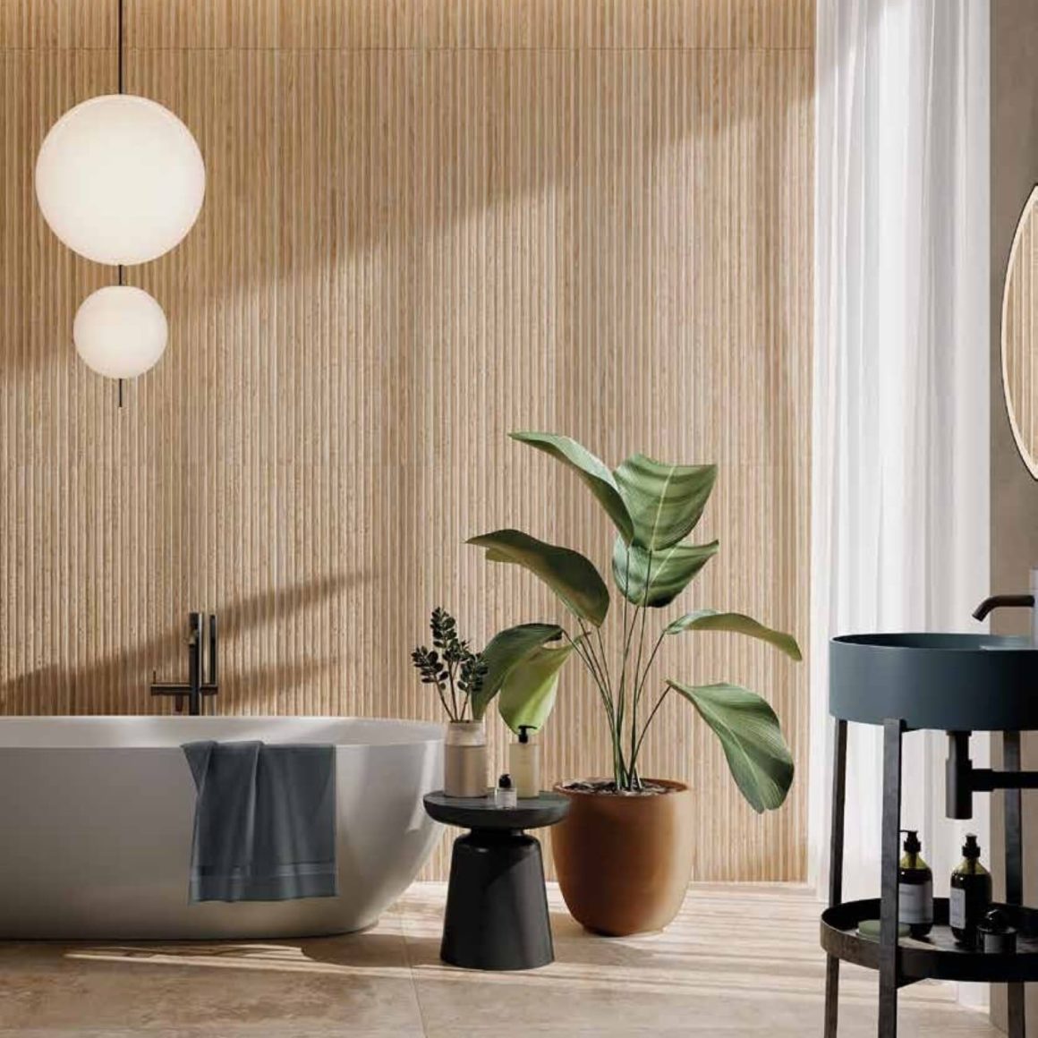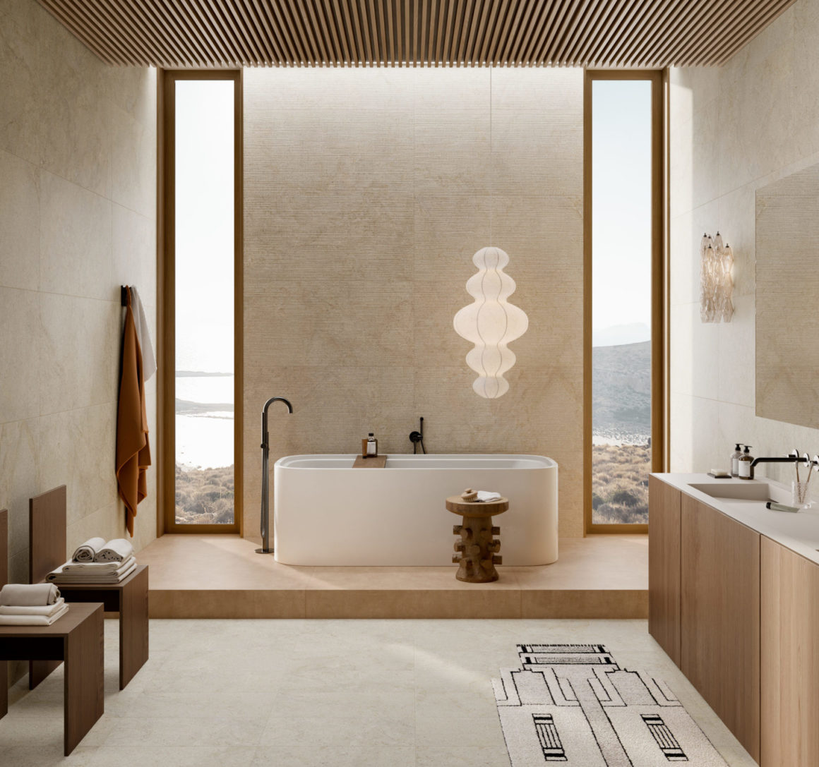 La tendance: les salles de bains de style spa sont devenues très populaires depuis une dizaine d’années. L’esprit général est minimaliste. Mais afin de créer une atmosphère qui évoque le bien-être, ces salles d’eau se dotent de matériaux naturels, de couleurs neutres et douces ainsi que d’un éclairage tamisé. Le carrelage reste un précieux allié pour créer ce type d’atmosphère dans la mesure où il imite aujourd’hui à la perfection les pierres locales et les parquets en bois. Ces effets de matière sur la céramique se déclinent de préférence sur des carreaux aux grands formats afin de donner à l’espace fluidité et homogénéité. Mais de nouveaux listels (petits carreaux fins) et des carreaux imitation bois cannelés investissent désormais ces décors naturels.