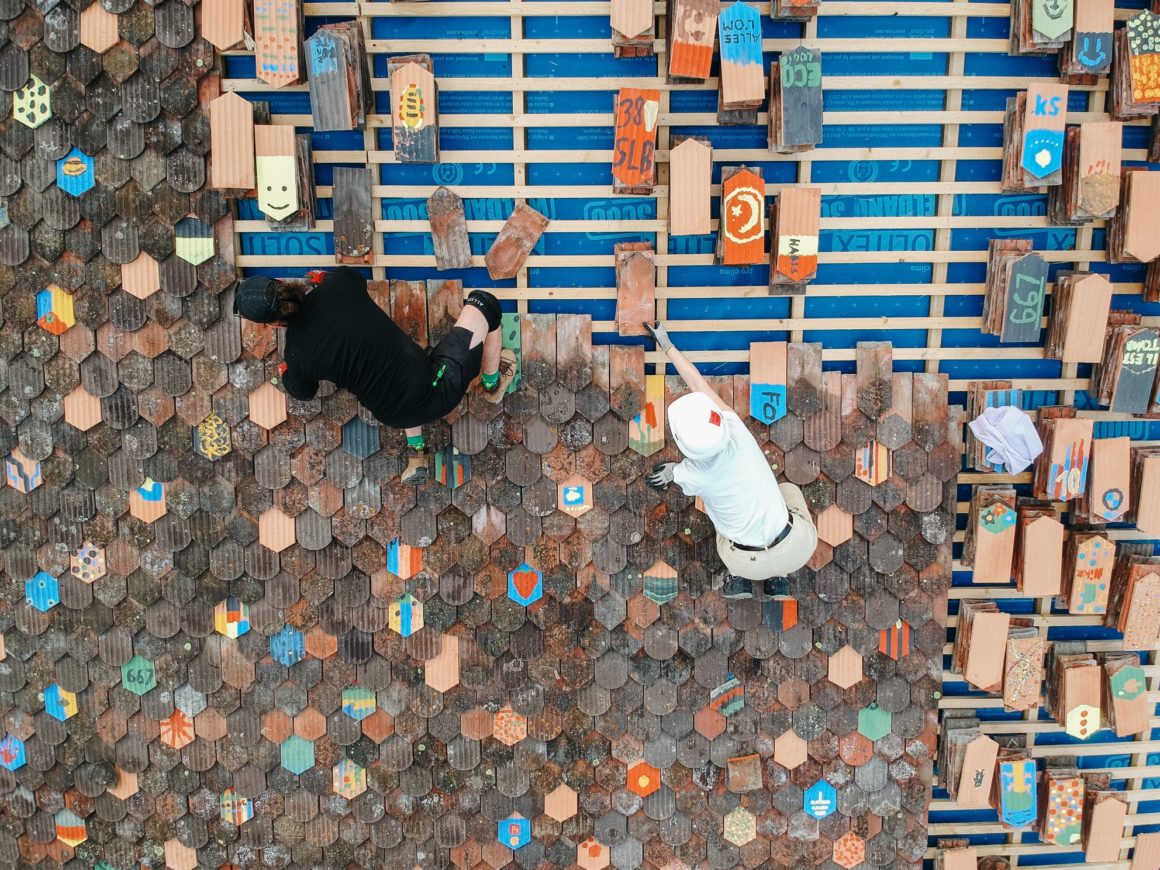 La construction du pavillon RebuiLT a été achevée en faisant, là encore, appel au réemploi. Ainsi, une grande partie des tuiles et des chevrons de la toiture ont été récupérés sur d’autres bâtiments voués à la démolition. Le parquet a permis de redonner une deuxième vie aux lames de bois d’un appartement qui avaient été déposées suite à un dégât des eaux. Le plancher (sous-construction en panneaux OSB) vient du réaménagement d’un cinéma à Fribourg.