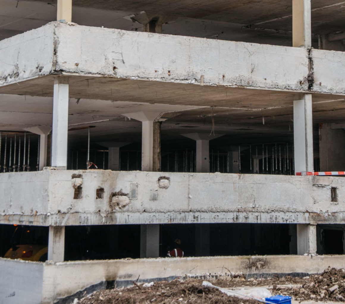 Pour sa construction, des planchers-champignons en béton armé et leurs colonnes de raccordement ont été découpés, déplacés en toute sécurité, puis réassemblés pour former la base structurelle du nouveau pavillon.