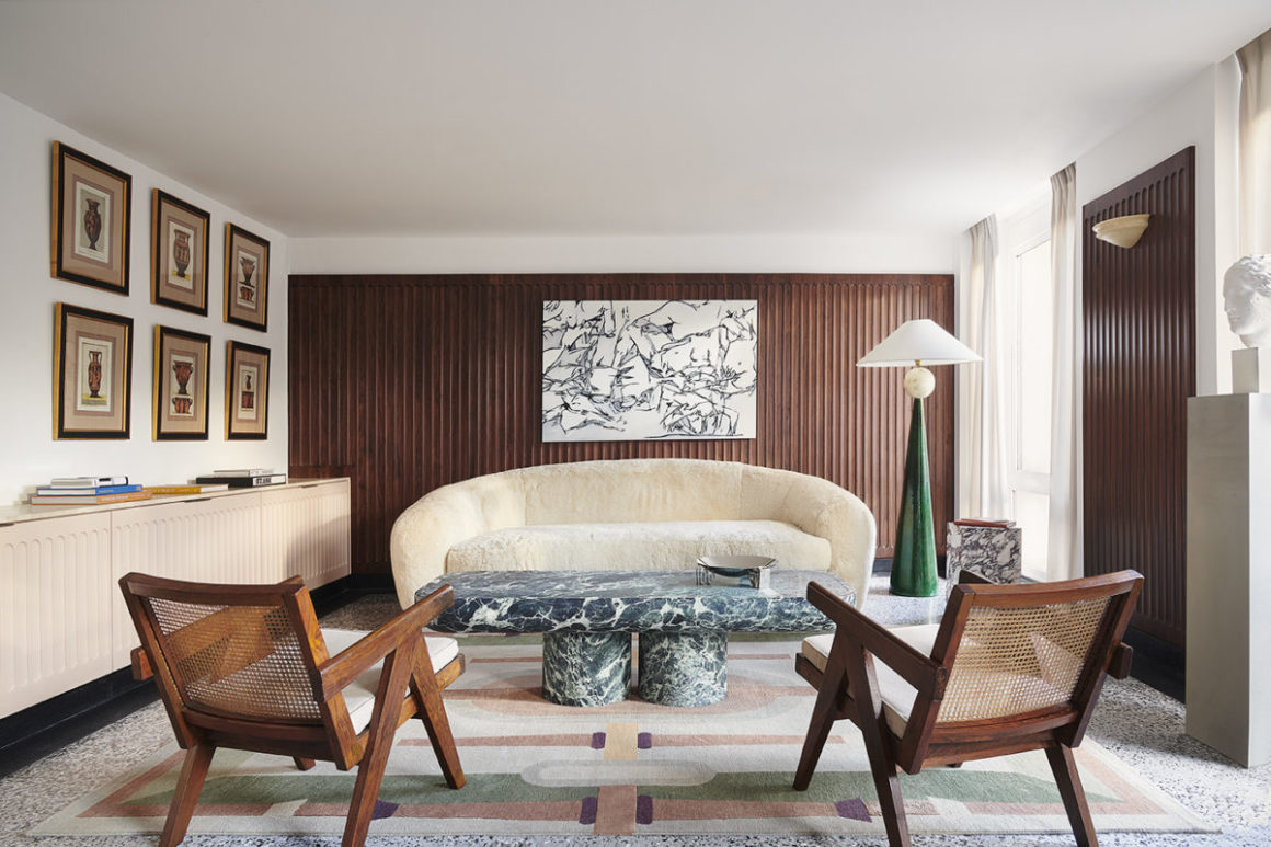 Un fauteuil en bois massif des plus sommaire (LTwid.com) est ici associé à des éléments de décor cossus: des fauteuils club des années 50 en velours, une table basse et une enfilade en bois de broussin. Intérieur: Mingotti Giordano.