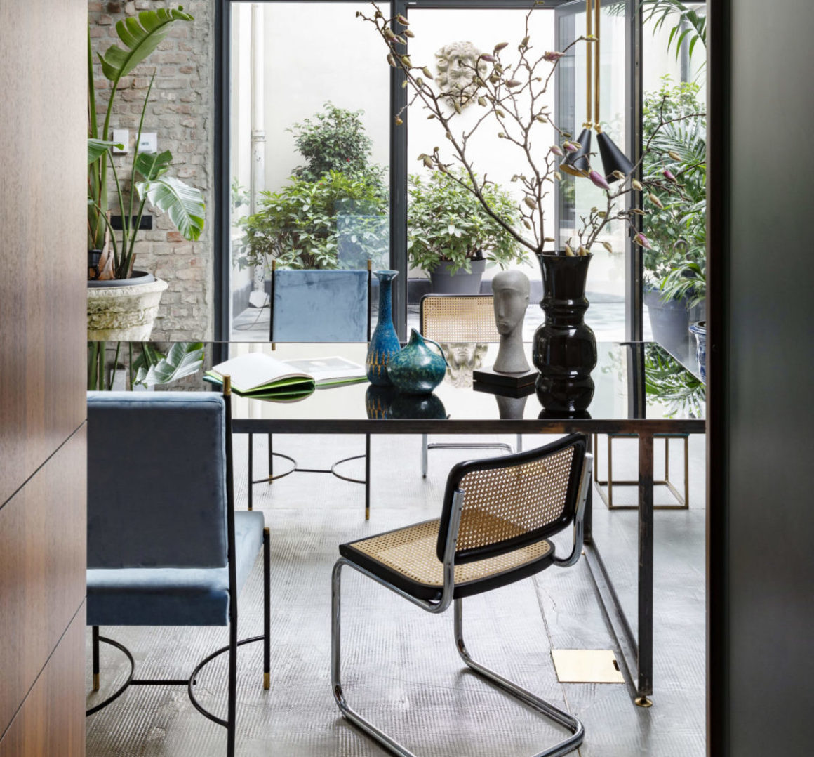 Chaise en cannage Cesca B32, design Marcel Breuer en 1920, édition Thonet ou Knoll. Le plateau de la table à effet miroir apporte transparence et légèreté. Intérieur: Mingotti Giordano.
