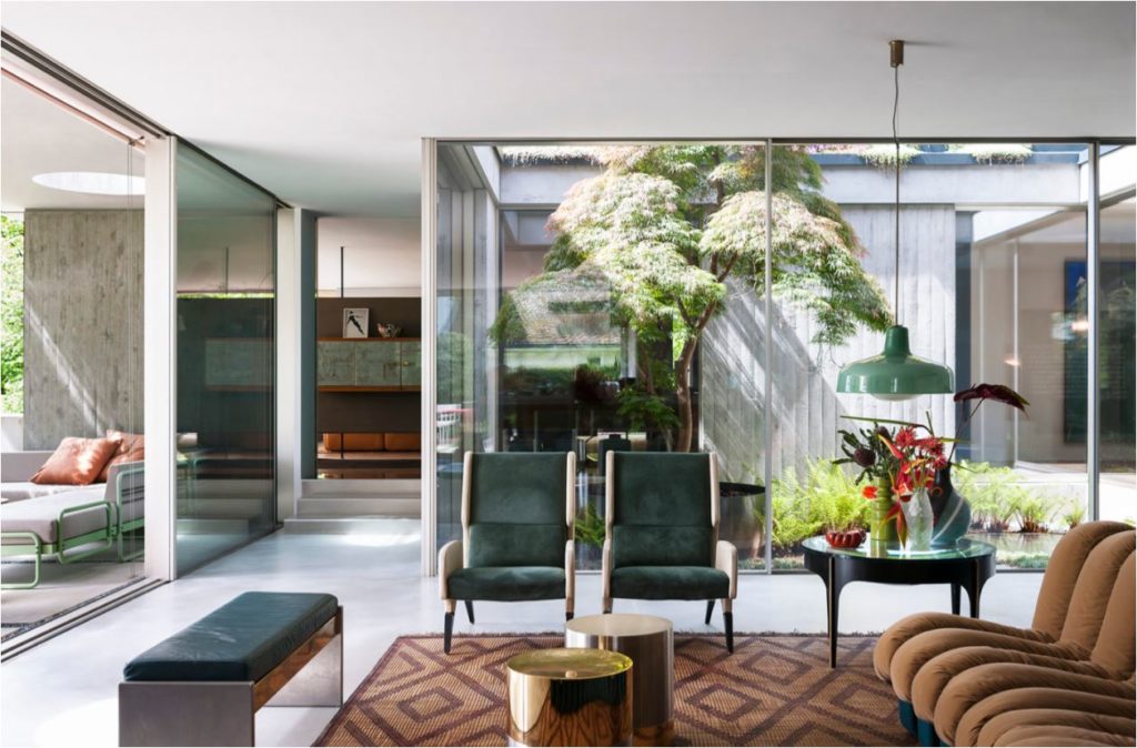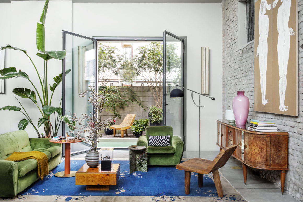Villa beyond the italian alps. Réalisation Dimore Studio. Canapé Non Stop De Sede (1970’s) et fauteuils Parco dei Principi de Gio Ponti (1960’s) recouverts de velours. Tables basses et banc en laiton Dimore Studio. Lampe Paolina d’Ignazio Gardella (1957).