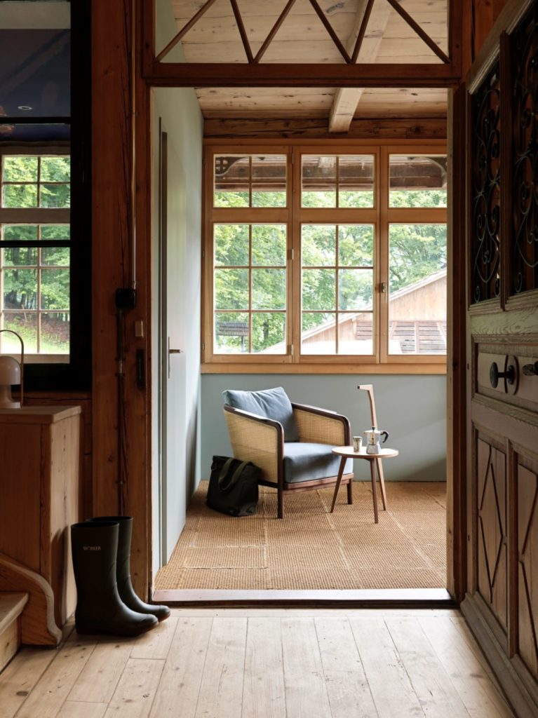 Fauteuil en fibres naturelles au sein d’un chalet d’alpage au décor épuré (aux environs d’Interlaken en Suisse). Ameublement Teo Jakob.