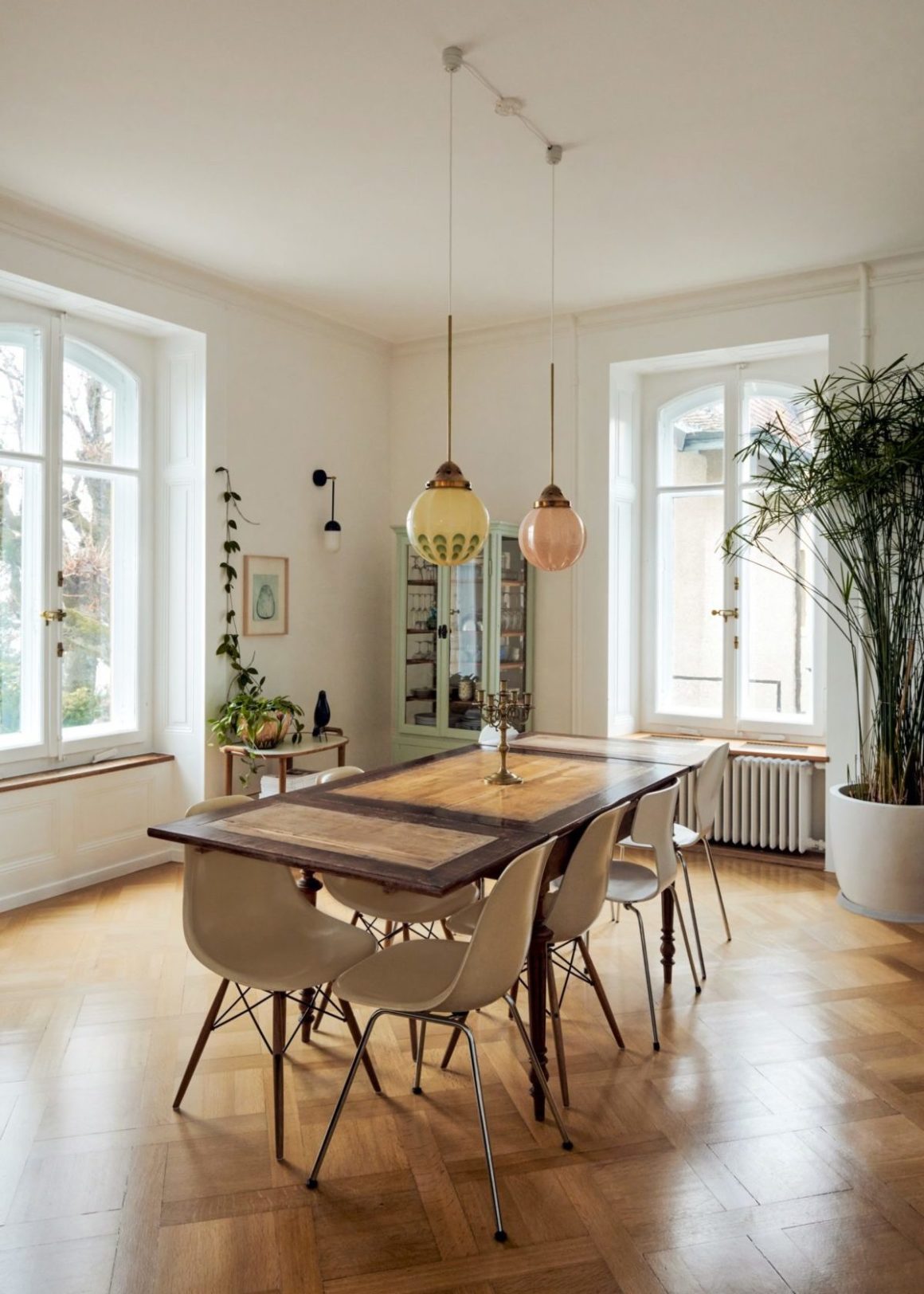 Les globes vintage des années 1930 sont ici associées à une table de ferme aux chaises Eames de Vitra.