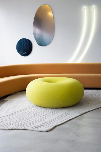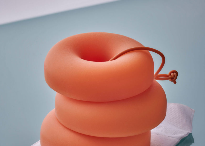 Depuis son plus jeune âge, Sabine Marcelis est émerveillée par la forme simple et complète du donut, sans coin ni extrémité. Concernant son fauteuil-beignet, la créatrice explique avoir longuement chercher un tissu en maille lisse sans couture afin de mettre en valeur la forme pure de l’anneau.
