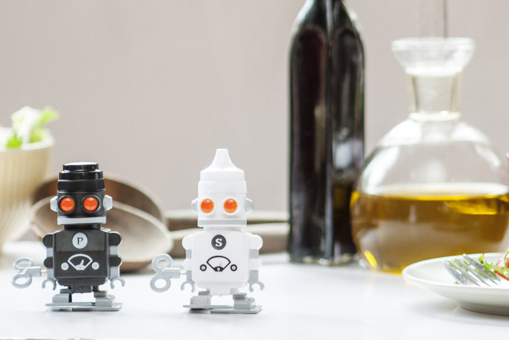 Salière et poivrière en forme de robots mécaniques, qui se déplacent en tournant sa manivelle, ‘Bots, design Mark Owens, Suck UK.