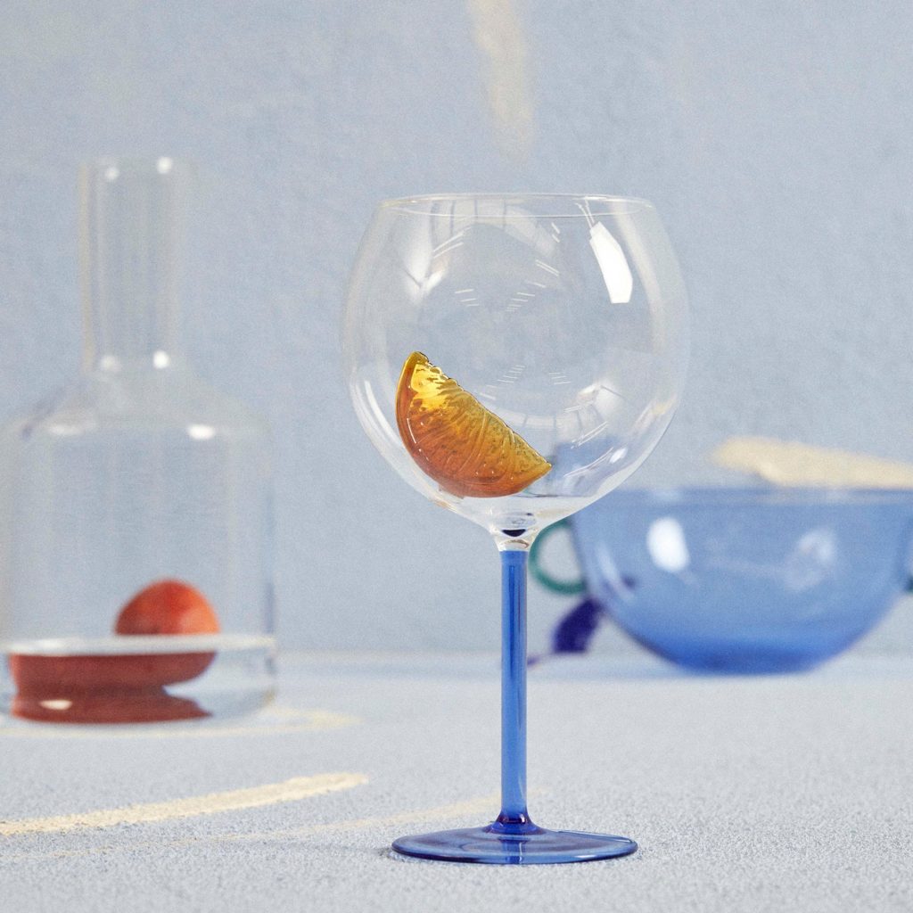 Une autre variante des verres à cocktail sur pied dont la capacité permet d’accueillir un spritz. The Signature glass with a twist, design Helle MardhalStudio.