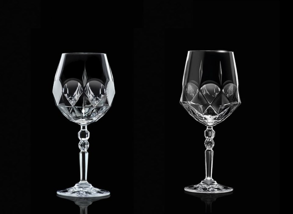 Verres ballons sur pied. Set cocktail de style Art Déco, collection Alkemist, RCR Cristalleria Italiana. Le verre de gauche est plutôt destiné auxcocktails à base de gin, celui de droite aux boissons comme le Spritz.
