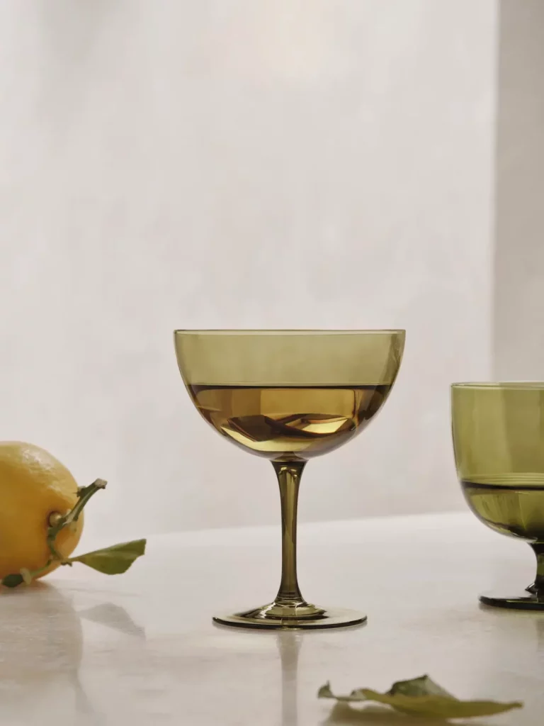 Host Cocktail Glasses de Ferm Living. Ces coupes à cocktails sur pied sont de plus grande capacité que les traditionnelles coupes à champagne.Elles peuvent ainsi accueillir des glaçons.