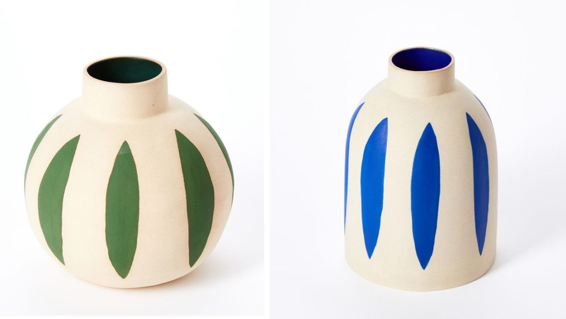 Le céramiste propose des céramiques en grès brut parés de couleurs franches et de motifs imparfaits tracés à la main.