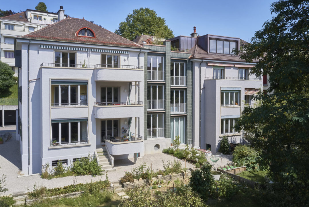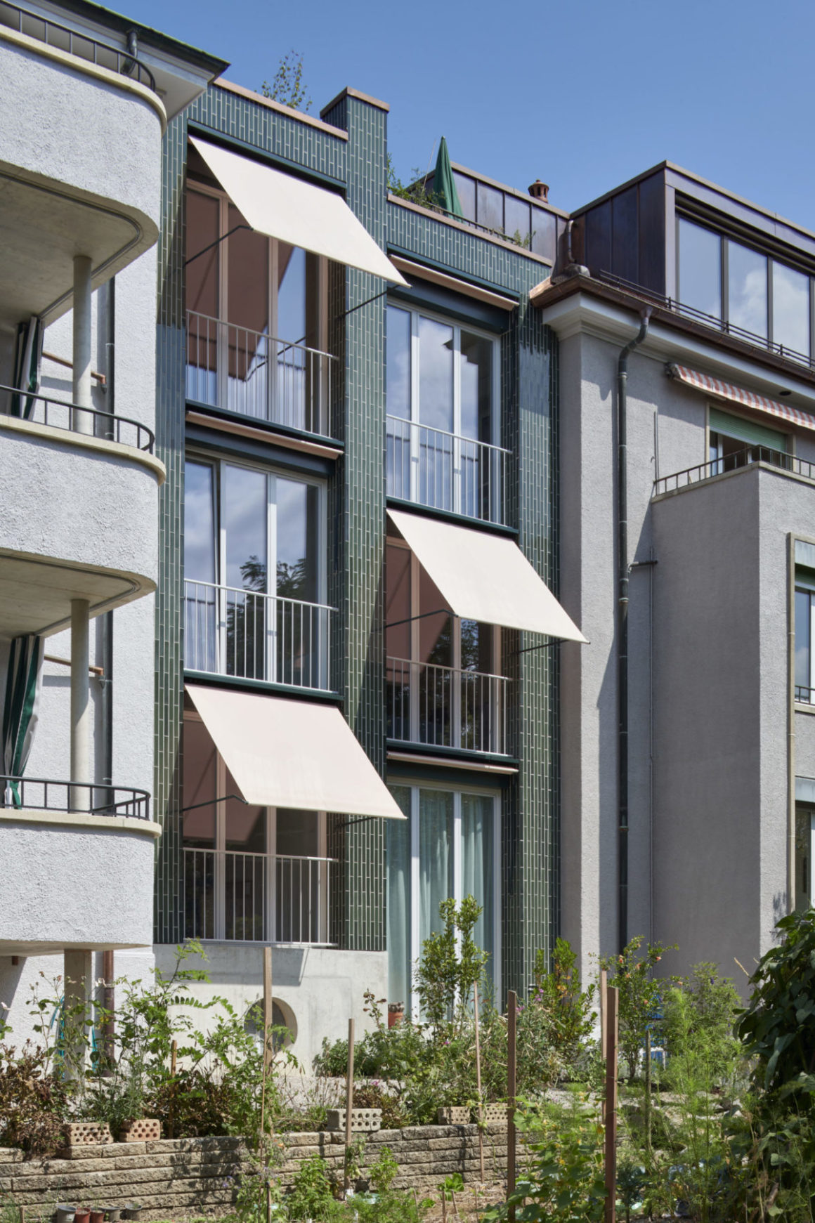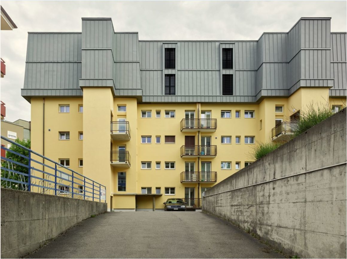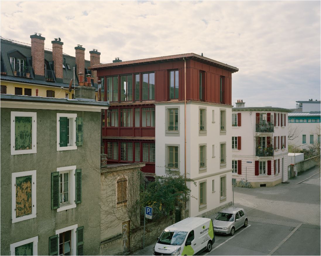 Dans un milieu bâti relativement dense, le remplacement des galetas par une surélévation a permis de mettre en valeur un objet bénéficiant d’une situation urbaine de premier ordre en ville de Fribourg.Cette surélévation a généré deux niveaux d’habitation comprenant douze appartements supplémentaires. L’un des enjeux majeurs de ce projet a été d’intégrer les loggias dans la volumétrie de la toiture en s’inspirant des mansardes parisiennes. « Si nous avions évidé les angles pour créer des balcons ouverts, nous aurions alors perdu ce langage de toiture », expliquent les architectes. Les stores des loggias ont été placés dans le plan des façades. Les percements des fenêtres et des loggias se confondent, favorisant ainsi une lecture homogène de la volumétrie.