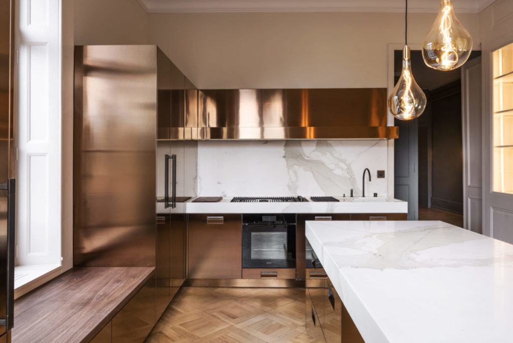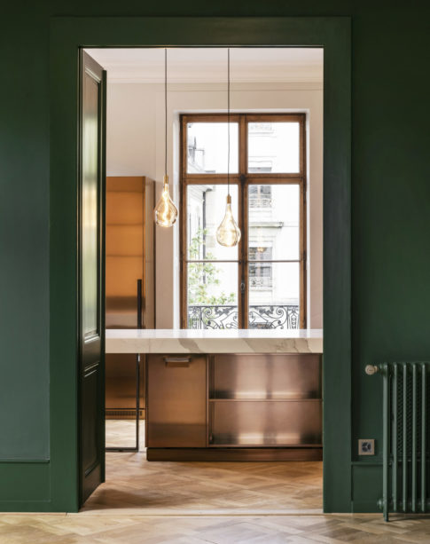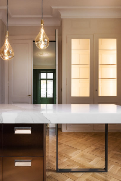 Le cœur du projet: Située dans une pièce carrée à un des angles du bâtiment, avec un accès direct au salon, la cuisine a conservé une bonne partie de son cachet d’antan. Le plafond et ses moulures, les murs et leurs anciennes plinthes, ainsi que le parquet en bois de noyer ont été entièrement restaurés. Idem pour les armoires d’origine et la double porte ouvrant sur le living et la salle à manger. Disposés autour d’un grand îlot central doté de multiples rangements, les éléments contemporains qui définissent la cuisine s’accommodent à la forme des fenêtres. Deux nouvelles textures viennent dialoguer avec l’existant : le marbre Calacatta et l’acier aux reflets cuivrés qui rappelle la nuance du parquet.