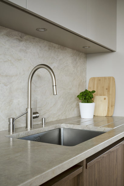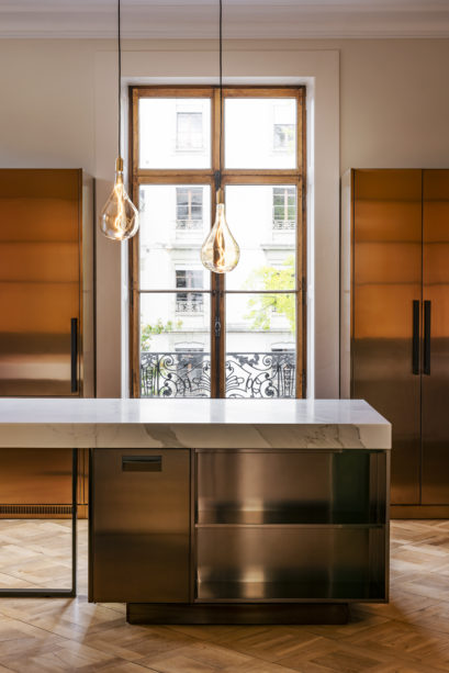 Equipement et matériaux: La cuisine a été réalisée en collaboration avec Sophie Zbinden d’Ambiance Cuisine à Genève. Le choix s’est porté sur le modèle Convivium Elegant de la marque Arclinea qui, avec son îlottable et ses meubles de rangement se déployant de part et d’autre, offre une composition aussi fonctionnelle qu’accueillante. Les façades de l’ensemble et la hotte sont habillées en acier inox d’une innovante teinte bronze obtenue grâce au traitement technologique du PVD (Physical Vapour Deposition). Les différents plans de travail, l’évier et la crédence sont eux en marbre Calacatta Oro.
