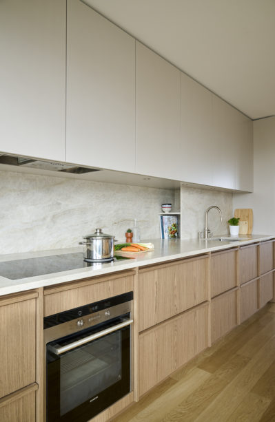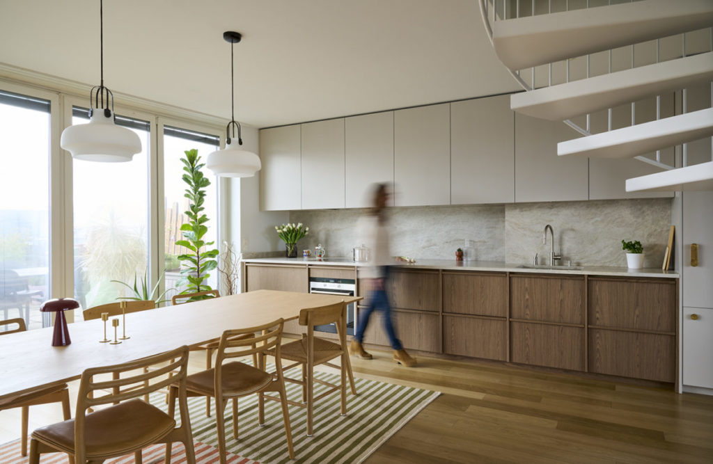 Le contexte: C’est à Genève, dans un bel appartement sis au 8e étage d’un immeuble du quartier de Chandieu, près des Nations Unies, que le bureau d’architecture d’intérieur Les Enfants Terribles a conçu ce projet de cuisine. Il a été réalisé sur mesure dans une alliance de matières naturelles et de teintes douces. La configuration du logement consiste en deux grands plateaux répartis sur deux niveaux. On y entre par l’étage inférieur où s’étend un lumineux espace traversant, doté de part et d’autre de larges terrasses. Au centre, un escalier en colimaçon permet d’accéder à l’espace nuit.