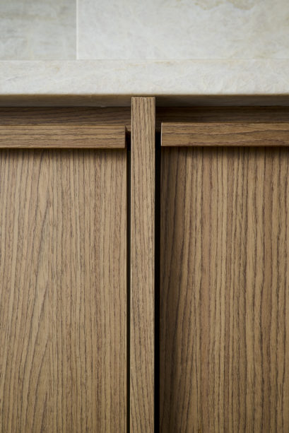 Equipement et matériaux: Les architectes ont dessiné le plan de travail avec une étendue de 90 cm afin d’offrir une double profondeur dans laquelle ont pu être aménagés une étagère cachée du regard et un dégagement dédié à l’intégration des différents éléments de cuisine. Ils ont opté pour un long meuble s’étirant jusqu’au séjour, habillé de façades conçues dans un placage en chêne foncé Alpikord. Les meubles hauts et les armoires jouxtant le salon sont ornés d’un laquage gris clair mat qui s’harmonise parfaitement avec le plan de travail en quartzite Taj Mahal « Esprit sauvage ». Les meubles colonnes sont assortis de poignées en laiton dont la nuance fait écho au bois blond de la table centrale.