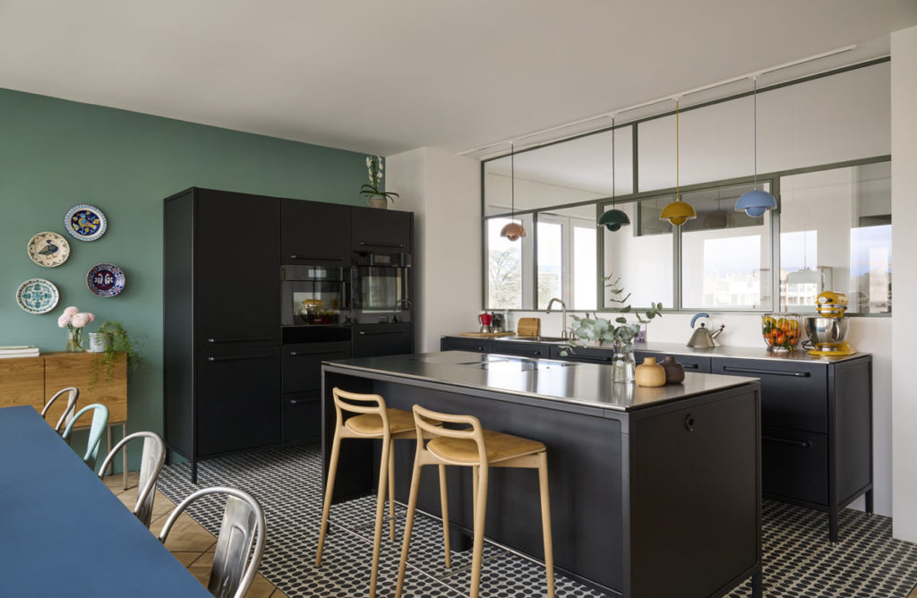 Le cœur du projet: Dans ce spacieux logement des années 60 comprenant une petite cuisine tout en longueur et un grand séjour, le projet inverse les espaces et crée des liens visuels par le jeu de parois partiellement vitrées. L’entrée a été redéfinie pour créer une grande cuisine/salle à manger et un séjour confortable, lesquels communiquent visuellement par le biais des verrières. Le décloisonnement des espaces offre d’intéressantes vues croisées entre les pièces ainsi qu’un jeu de lumière et de reflet parfois inattendu sur les vitrages et les murs. Le dispositif permet de cuisiner en ayant toujours une vue sur l’espace à vivre de même que sur la rue et le Jura par les grandes baies vitrées qui amènent beaucoup de luminosité.