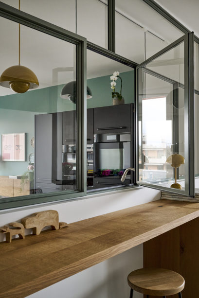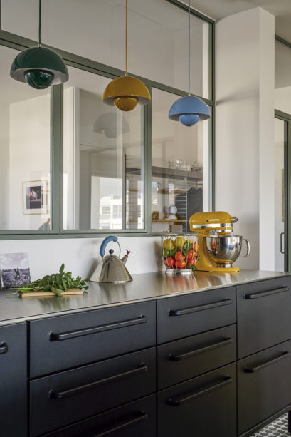 Equipement et matériaux: Les éléments d’origine, comme les menuiseries et le parquet mosaïque avec filet de Wengé, ont été conservés. Les interventions nouvelles ont été réfléchies pour intégrer l’existant aux actuels modes d’habiter et l’adapter aux préférences de la propriétaire. Pour renforcer l’idée de pièce à vivre, le choix s’est porté sur les modules de cuisine Vipp dont les éléments sur pieds évoquent des meubles. L’approche architecturale, les équipements et les matériaux sont sobres et affirmés de manière à recevoir le joyeux et éclectique aménagement de Marie qui a fait preuve d’une confiance et d’un enthousiasme précieux dans la rencontre des pratiques.
