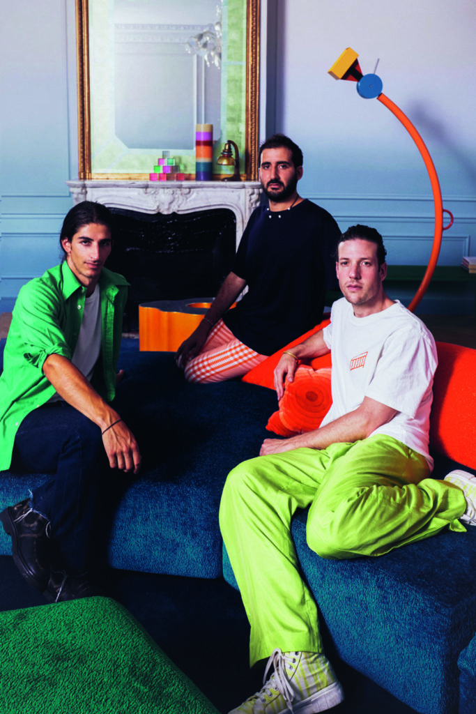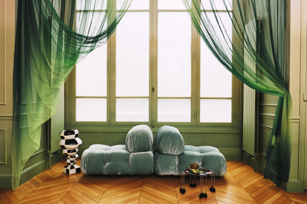Canapé modulable d’Edra, chaise en mosaïque de verre du designer français Arthur Ristor. Voilages en dégradé de bleus de Justin Morin.