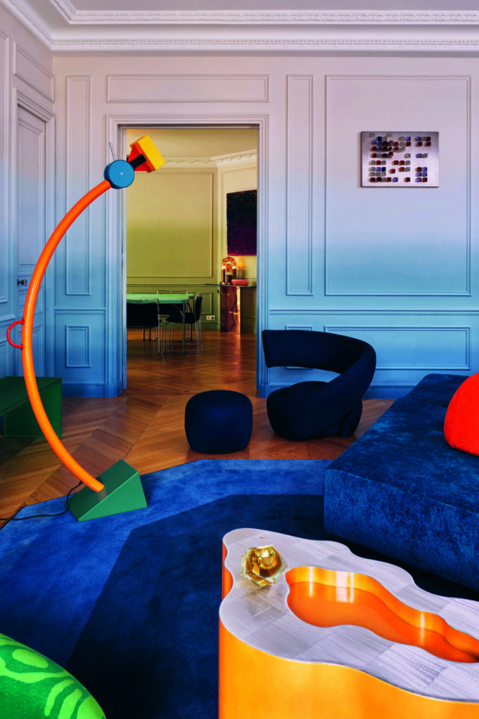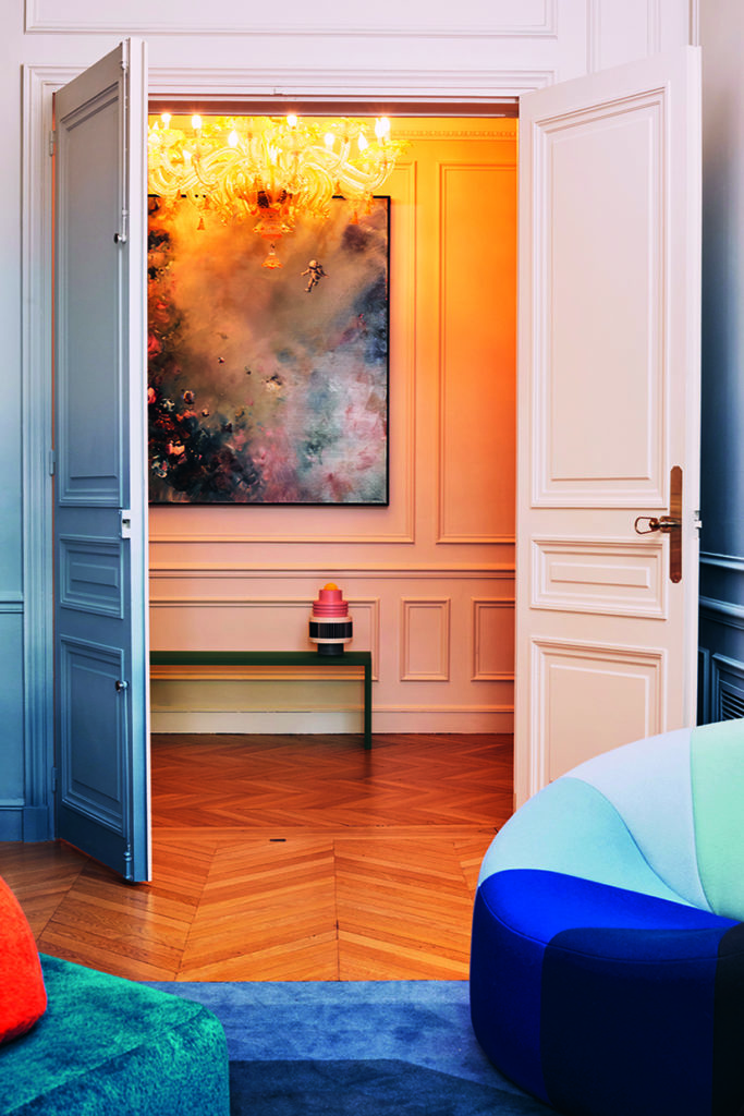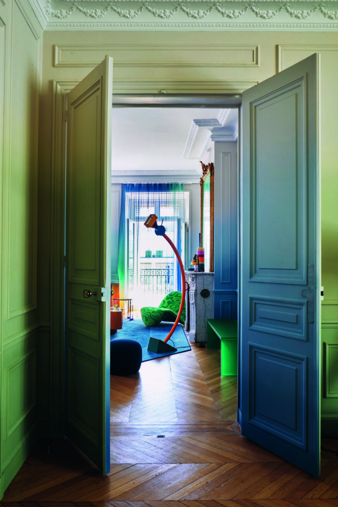 Des associations ludiques et chromatiques qui cassent les codes du style haussmannien. On passe par exemple du vert au bleu entre la salle à manger et le salon.