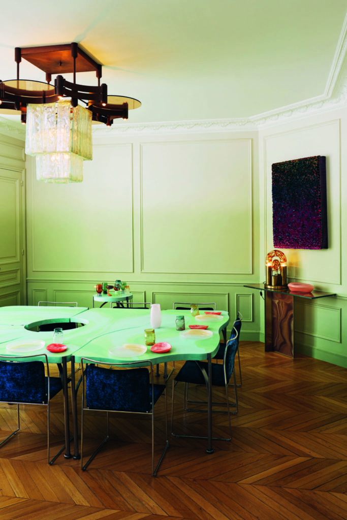 Dans la salle à manger par exemple, la grande table au plateau en résine de forme organique empruntant l’esthétique de la malachite est divisée en sept parties, qui peuvent être utilisées seules ou assemblées. En guise de clin d’oeil, le piètement en acier, conçu sur mesure, reprend le principe des griffes retenant le diamant d’un solitaire sur son anneau.