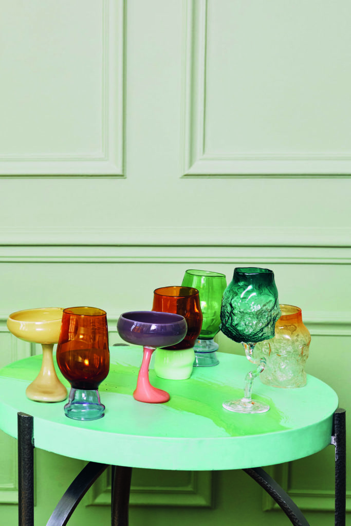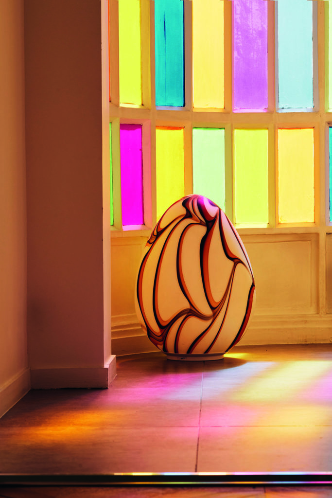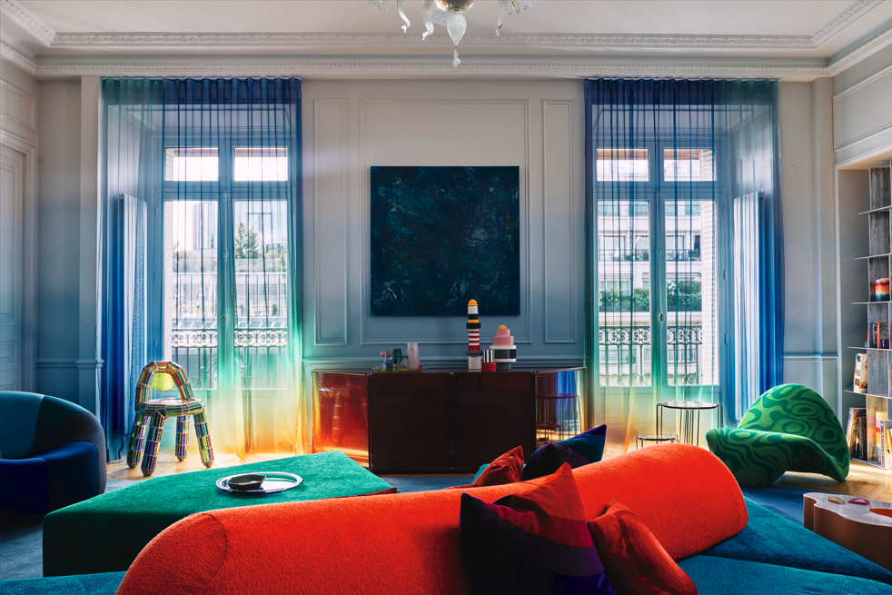 Si les formes rappellent l’univers de la bijouterie, les matières et les couleurs lui sont également empruntées. Du grand miroir octogonal fait de feuilles d’argent vertes et bleues dans le salon au lustre de Murano bleu laiteux opalin, en passant par les tables de Glas Italia aux nuances multicolores, tous reflètent et réfractent des éclats de lumière colorée, comme une pierre précieuse polie, pour un effet magique. Le dégradé abstrait de la console Odd Matter, en dialogue avec les dégradés des voilages drapés en soie de l’artiste Justin Morin, révèle des tonalités intenses et poétiques.
