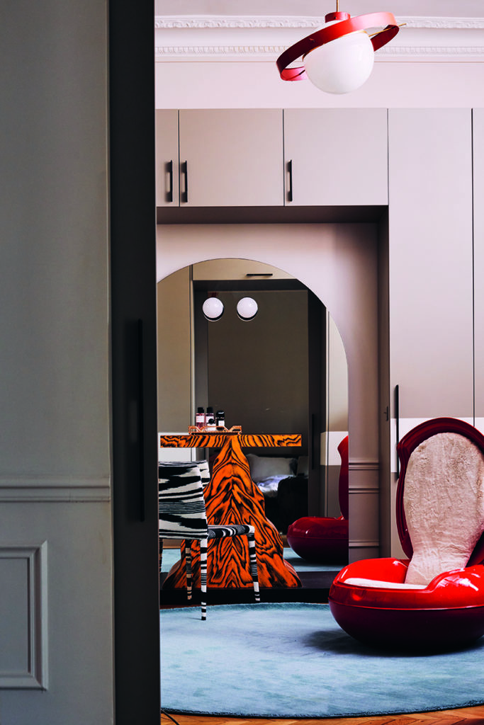 Dans l’alcôve dressing faisant face à la chambre, une étonnante coiffeuse en marqueterie du designer italien Ettore Sottsass ressemble davantage à de la pierre sculptée qu’à du bois. L’iconique siège pliable Garden Egg Chair du designer hongrois Peter Ghyczy dialogue dans une ère spatiale avec la suspension Planète imaginée par le collectif spécialement pour les lieux.