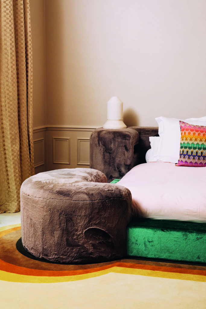 Dans le salon, le même type de références à la joaillerie. Le canapé modulable octogonal d’Edra, dans des tons de bijoux électriques, semble être le reflet des éclats de lumière colorés de la chaise en mosaïque de verre réalisée par le designer français Arthur Ristor.