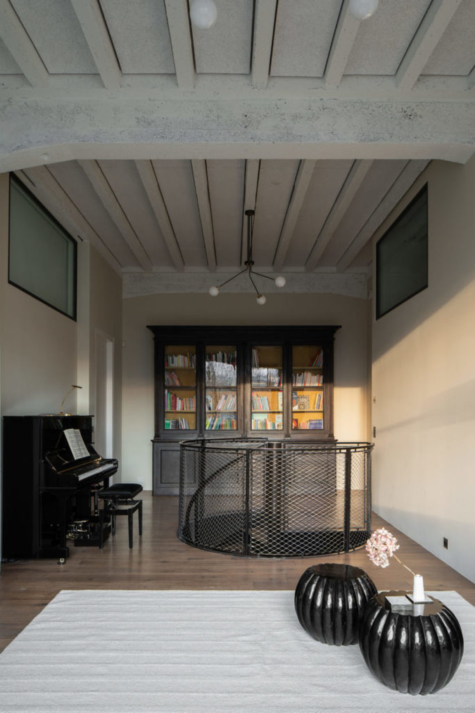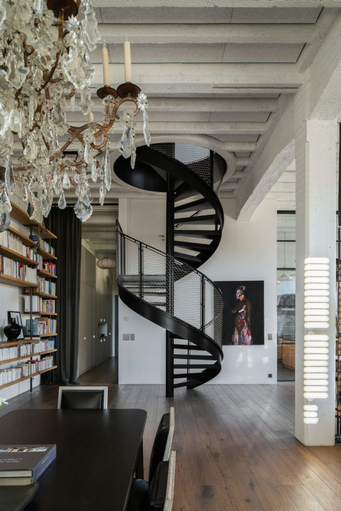 Le loft de près de 400 m2 se déploie sur deux étages reliés par un escalier en spirale en métal noir. Le passé industriel du lieu transparaît dans tout l’appartement. La structure de l’usine automobile a été entièrement préservée en raison de l’importance de ses qualités architecturales représentatives de l’industrie suisse du début du 20e siècle. La hauteur des plafonds culmine à près de 4 mètres, les poutres en béton sont apparentes et les encadrements en acier du vitrage rappellent la fonction première du bâtiment.
