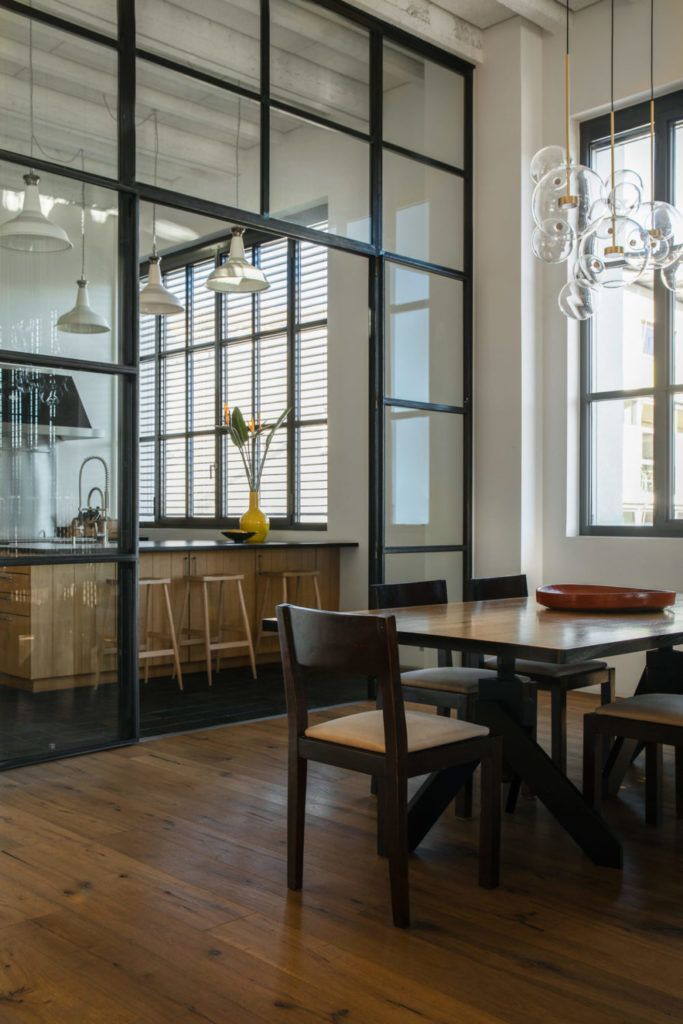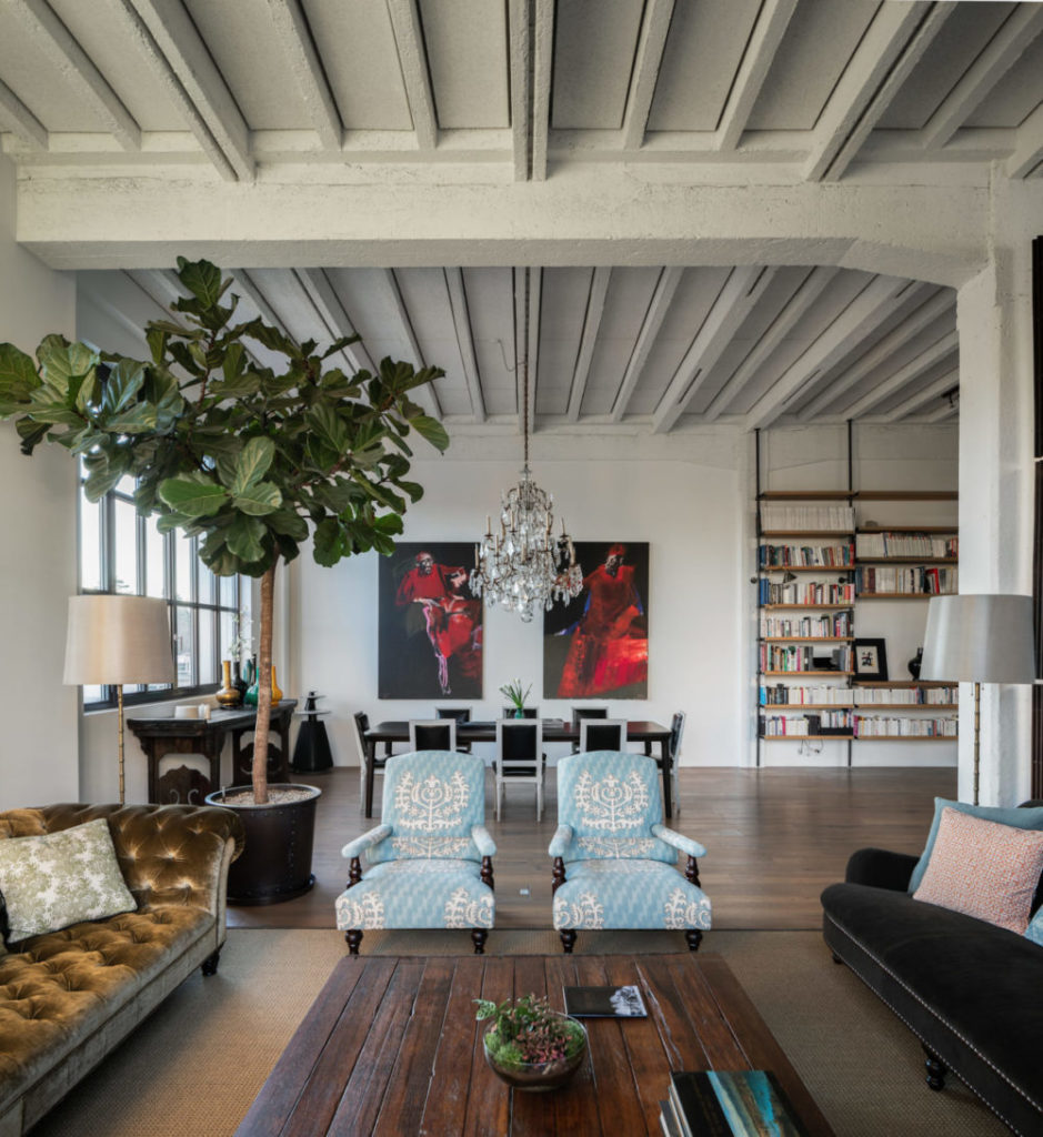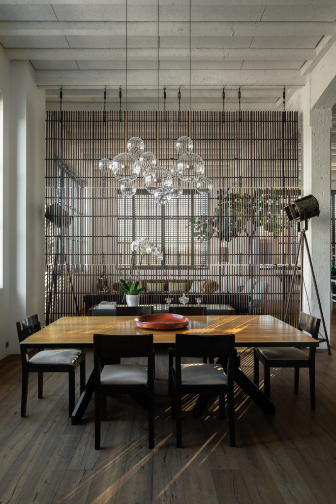 Partout, le mobilier contemporain dialogue avec les objets ethniques. Le métal et les éléments bruts juxtaposés aux matériaux classiques et sophistiqués s’intègrent parfaitement dans cet environnement si profondément industriel. Une transformation qui célèbre la cohabitation et la beauté singulière.