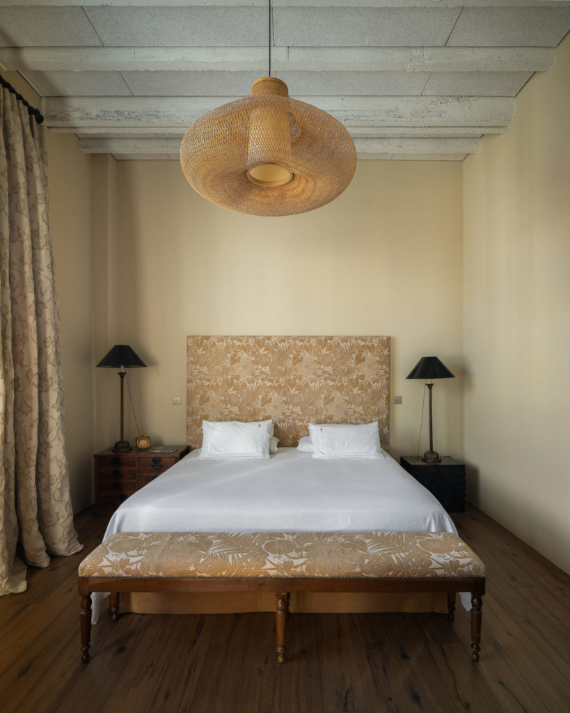 Dans la chambre, des stores en bambou filtrent la lumière et de lourds rideaux en lin habillent la fenêtre avec élégance. Le lit et le bout de lit capitonnés apportent de la texture et viennent rompre cette sereine beauté asiatique en apportant une délicate note classique.