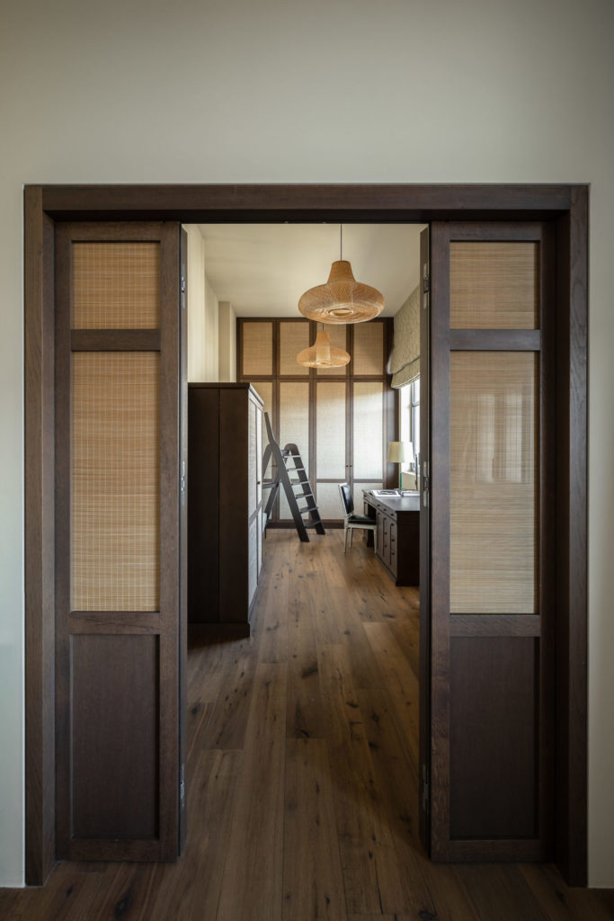 Au deuxième étage, des rideaux en lin gaufré, des tissus sophistiqués, des stores en bambou et des bois nobles sur un fond de tons chauds, associés à une lumière naturelle bien dosée, insufflent une sérénité feutrée et une intimité raffinée à l’espace nuit. L’ambiance est d’inspiration asiatique, les portes de communication et de placards en bambou thaïlandais ont été fabriquées sur mesure.
