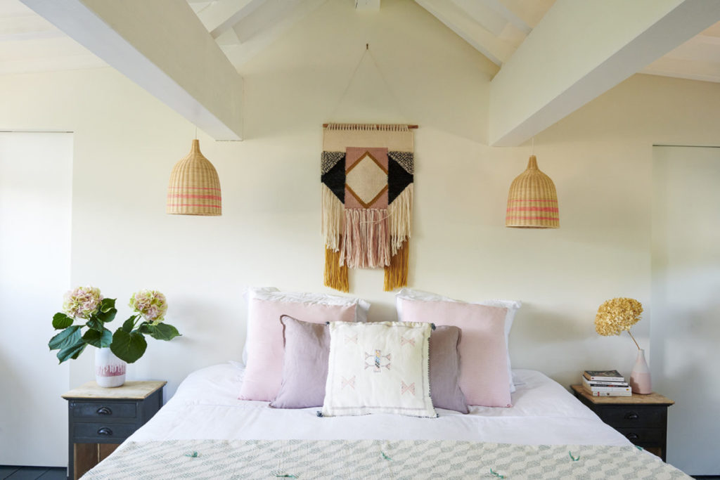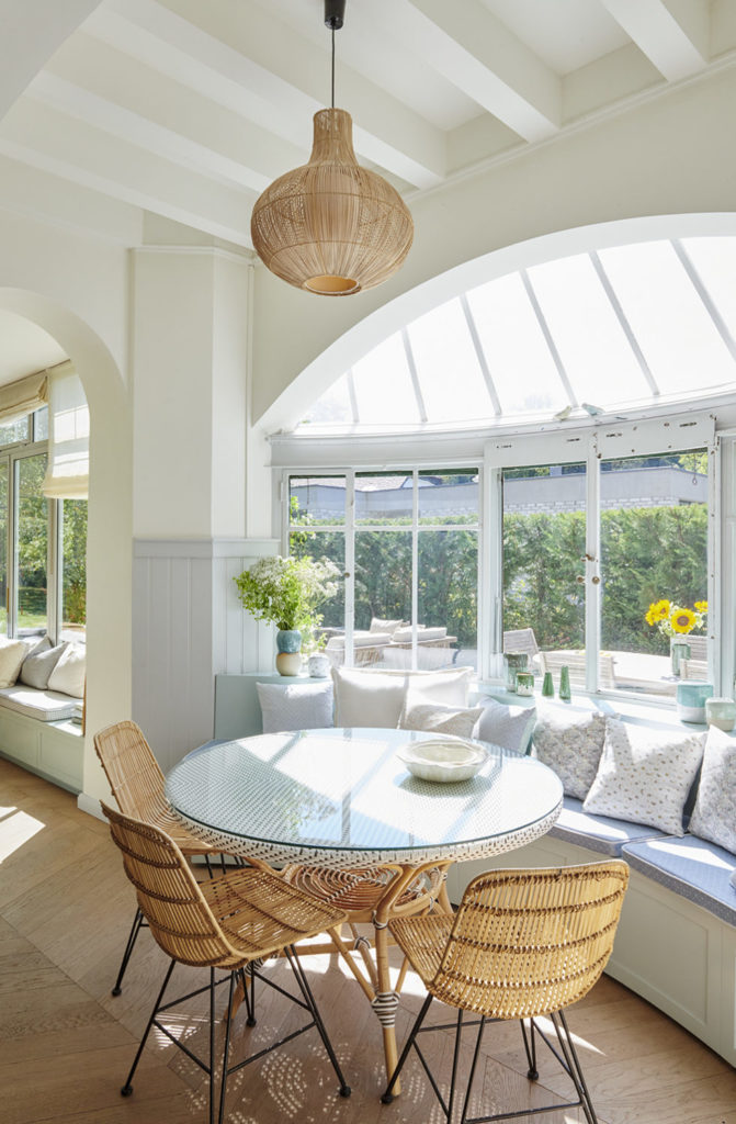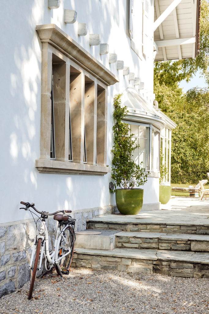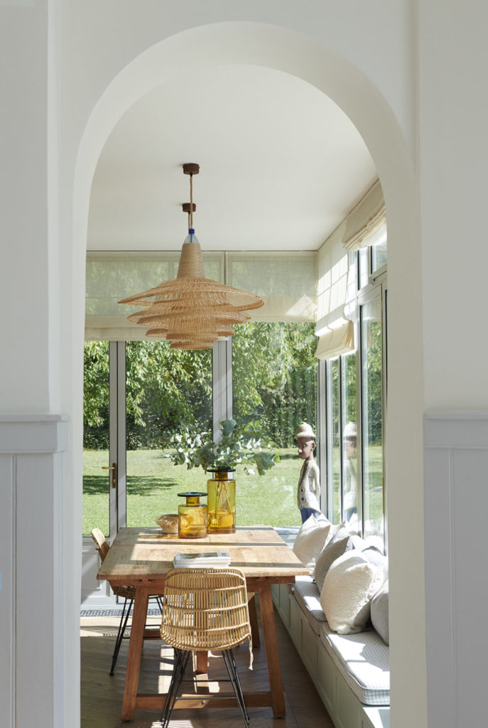 « Je voulais un style maison de vacances, dans l’ambiance des bungalows du Cap Ferret ; une déco poétique et rustique chic à décliner du salon aux chambres, avec des meubles en bois, des chaises tressées, des boiseries peintes dans des tons chauds, des papiers peints qui font rêver, des coussins à profusion, des vases avec des fleurs fraîches… un style simple sans artifice. J’ai ainsi privilégié les matériaux naturels en phase avec l’histoire de la maison et les extérieurs ».