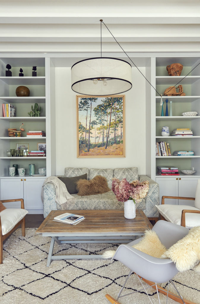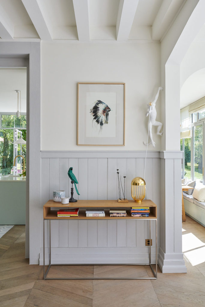 L’intérieur, composé de multiples petites pièces étriquées, a été entièrement rénové. « Notre idée était de privilégier les volumes ouverts pour créer deux vastes pièces centrales, carrefours de la vie familiale. Plusieurs murs ont été abattus, les faux plafonds ont disparu, révélant des poutres en bois brut que nous avons modernisées en les peignant en blanc » explique Louisa.