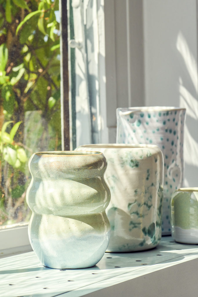 « Le petit coin romantique sous la fenêtre en demi-cercle est devenu mon lieu de travail à la maison ; l’arrondi de la fenêtre et la luminosité en font le lieu idéal pour exposer mes nouvelles céramiques » poursuit Louisa.