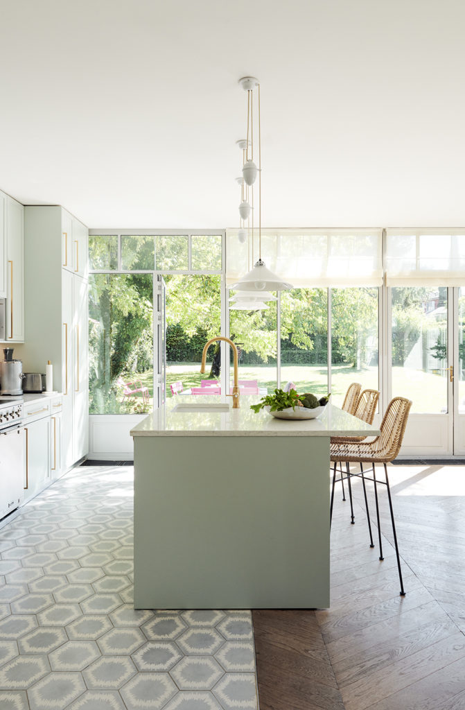 À cet étage, aucun sol d’origine n’a pu être préservé. Les propriétaires ont donc opté pour un parquet en chêne brut, posé en point de Hongrie, dont la trame sert de fil conducteur entre les pièces en créant une fluidité visuelle. L’entrée semble se fondre dans le salon qui à son tour se fond dans la cuisine et la salle à manger. Dans la verrière, ajoutée à la maison depuis de nombreuses années, les murs sont tombés, ce qui a laissé place à un bel espace cuisine-salle à manger très lumineux.
