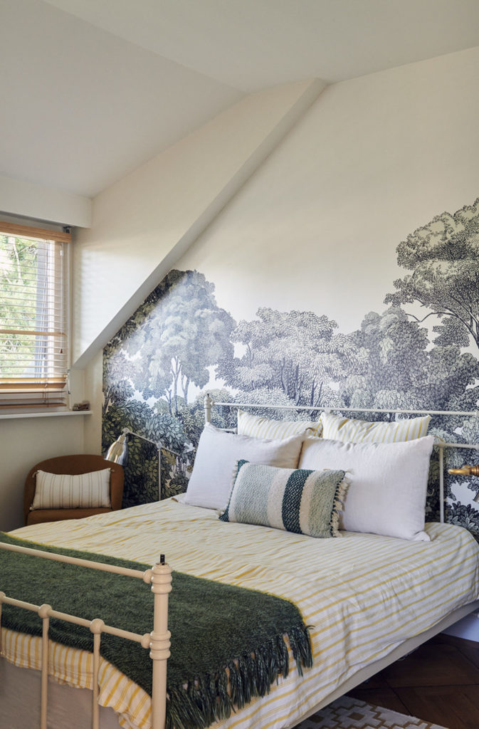 Au premier étage, où se trouve entre autres la chambre des enfants, les propriétaires ont pu conserver les sols qui étaient beaux et en bon état. En toiture, la création d’un « chien assis » a transformé une pièce très sombre située sous les toits en un lieu ultra accueillant, baigné de lumière, avec vue sur le sommet des arbres et le lac ; c’est là que se trouve la chambre parentale et sa salle de bain.