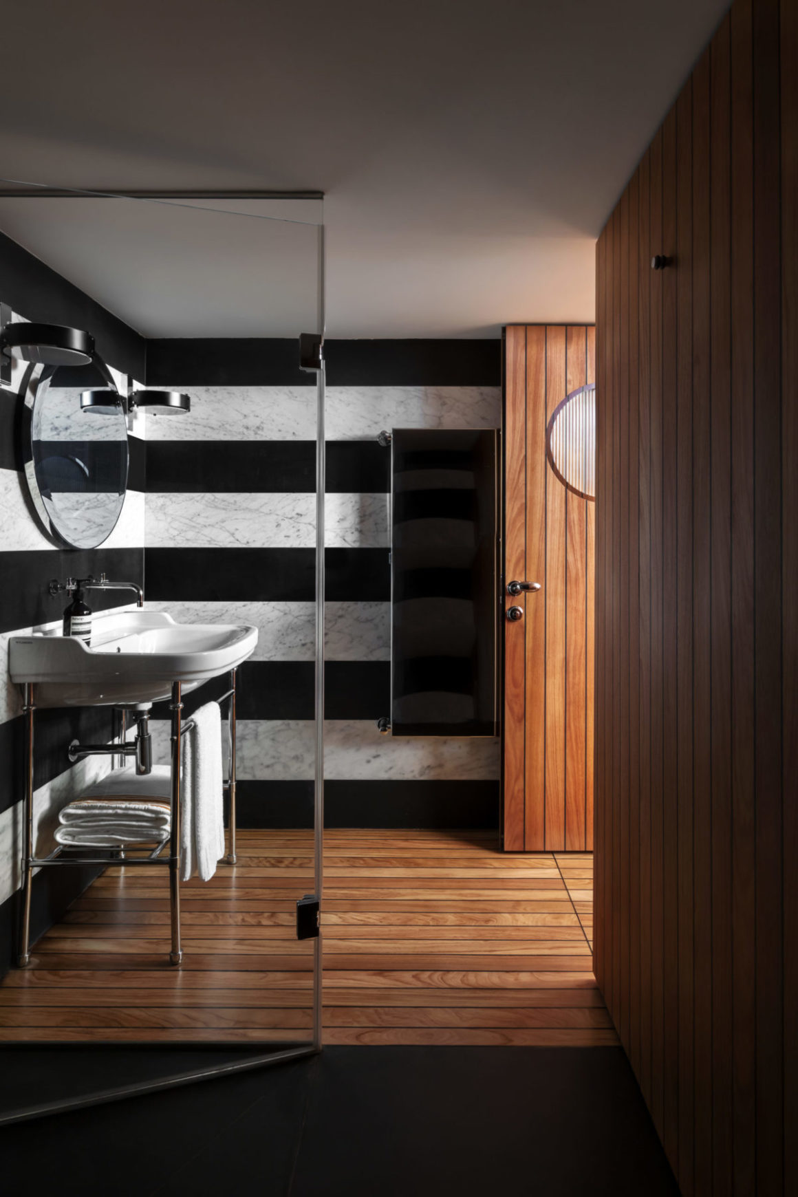 Tout le projet a été réalisé en utilisant des matériaux naturels et traditionnels. «Nous avons utilisé du teck naturel traité à l’huile avec du mastic spécial marine pour les sols et les meubles et du plâtre blanc naturel pour les murs. De l’ardoise noire locale, l’Ardesia, avec du marbre blanc de Carrare pour les salles de bain.».