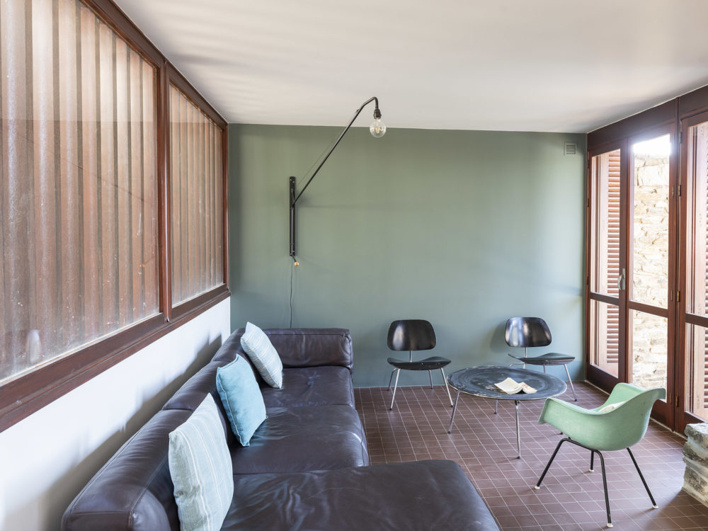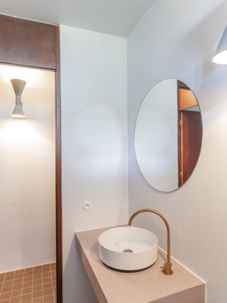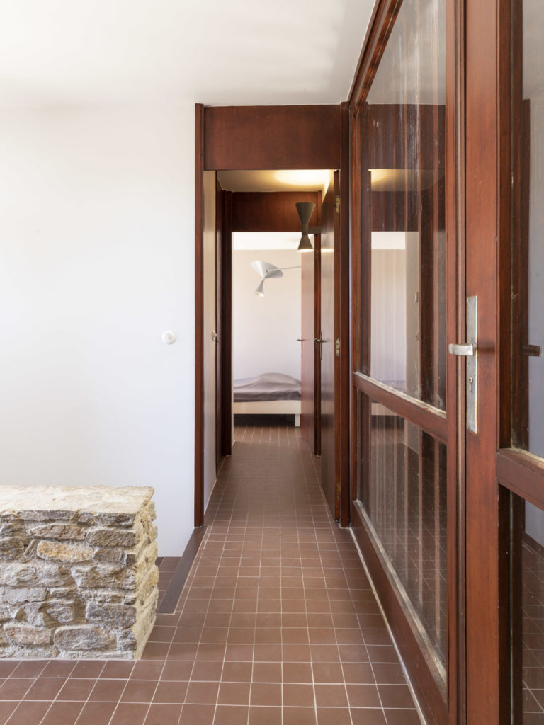 En 2018, la maison a été entièrement rénovée et meublée dans le respect de son architecture et dans l’esprit des années de sa construction. La transformation accomplie par le bureau 2b architectes a voulu réinterpréter, sans dénaturer, le caractère et les matérialités présentes: carreaux de grès cérame posés sans joints sur l’entier des sols, les salles de bain et le plan de travail de la cuisine; déclinaisons de couleurs sixties selon les espaces et programmes; restauration et parfois reconstruction dans l’esprit d’origine des fenêtres, des volets et persiennes, des armoires intégrées et des meubles en bois de la cuisine. Quant au choix des interrupteurs électriques et de la robinetterie en cuivre, il a été fait dans le respect du vocabulaire stylistique et matériel présent, en respectant l’époque de construction.