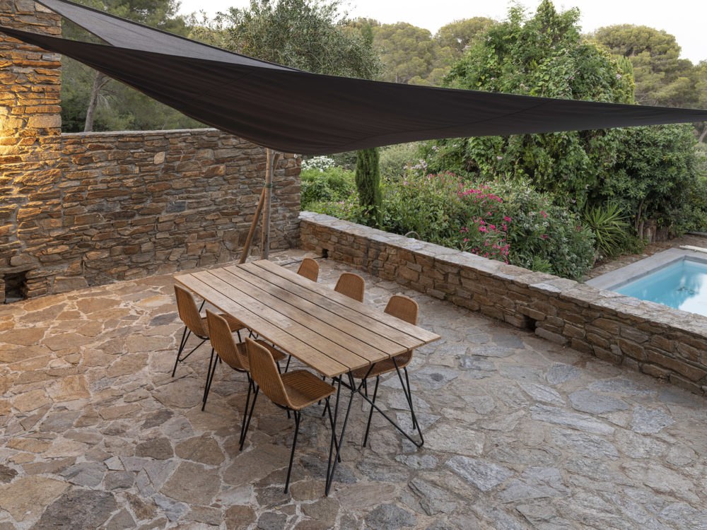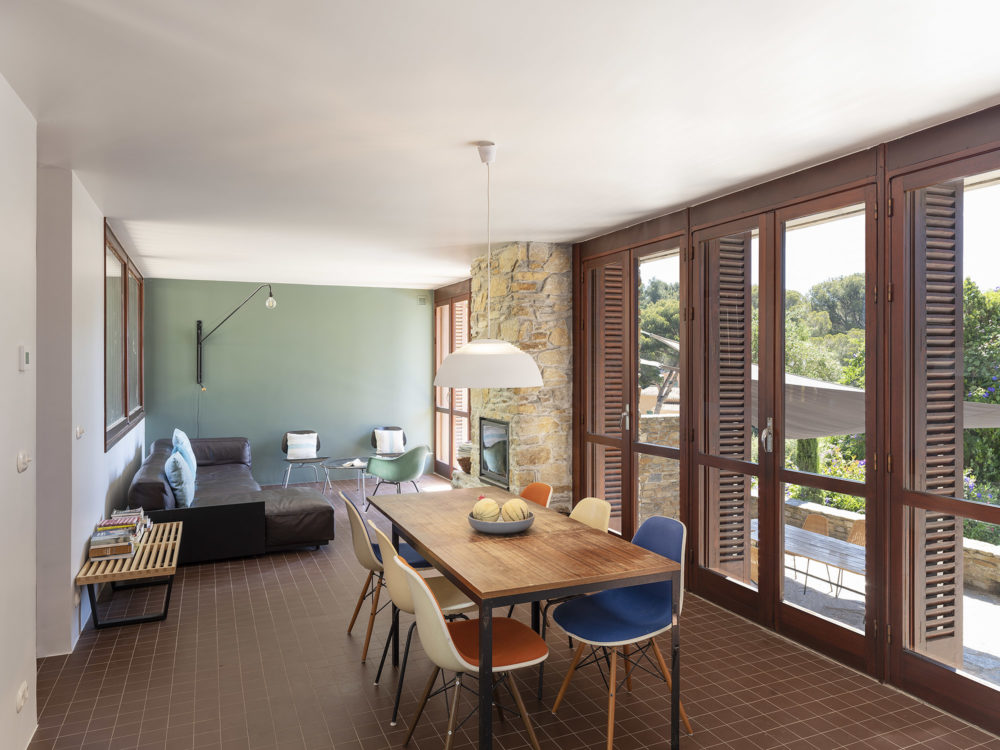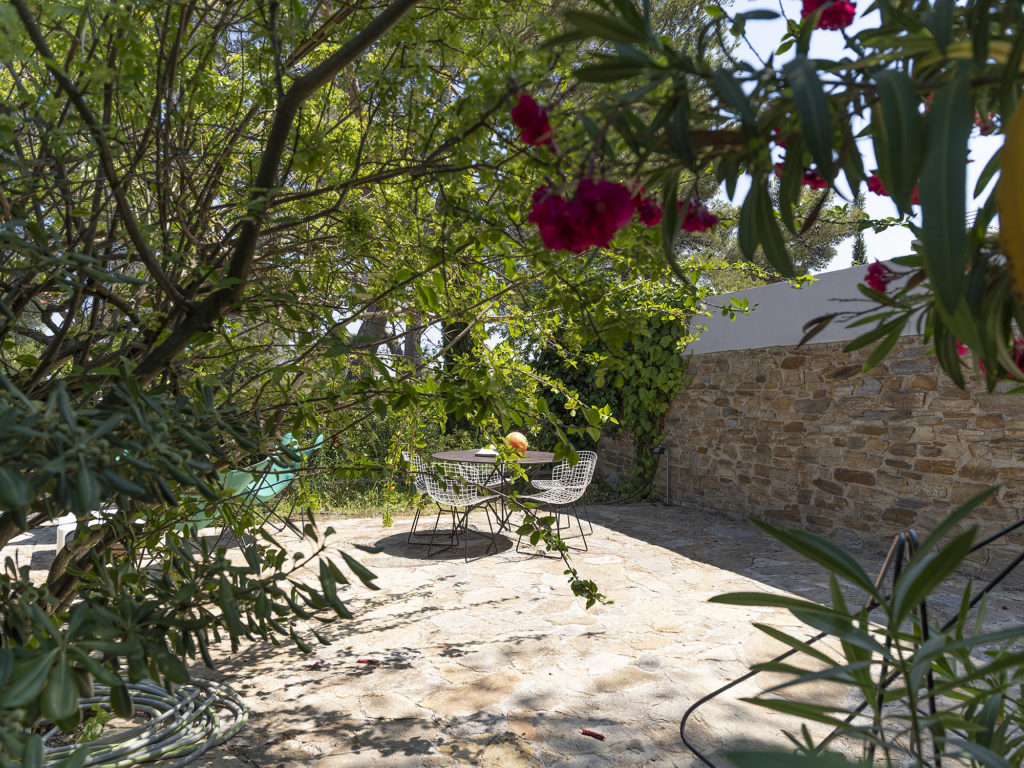 Une grande terrasse étend le séjour au sud alors qu’en contrebas, une piscine prend place, en lien direct avec les chambres. En direction de la mer, située à 500 mètres, un vaste jardin planté d’essences méditerranéennes complète les prolongements extérieurs de la maison. Articulée selon le terrain naturel sur deux niveaux, totalisant environ 90 m2, l’habitation se compose d’un grand séjour avec cheminée, d’une cuisine laboratoire et de trois chambres indépendantes, accompagnées de deux salles de bain et d’un WC ainsi que d’une chambre indépendante et de sa salle de bain se trouvant sous la terrasse principale.